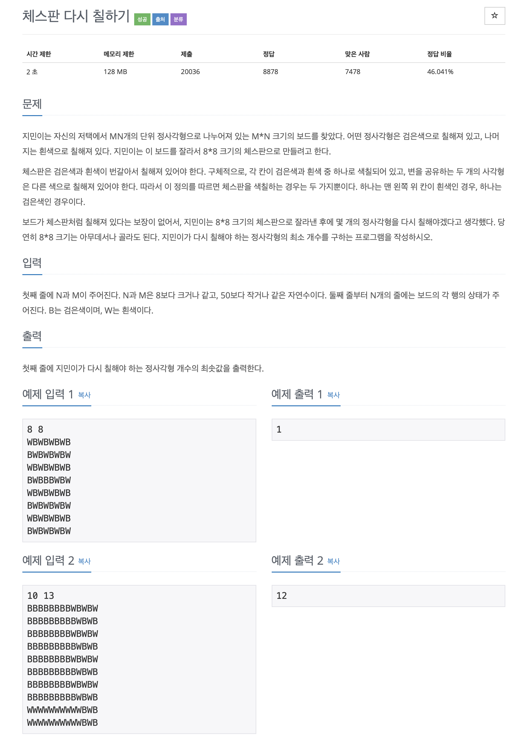 다만 필자가 정답률이 왜이렇게 낮은지 찾아보니까, 검사하려는 8×8 배열에서 첫번째 칸이 하얀색일 때와 검은색일 때, 두 경우의 수를 미처 생각하지 못해 틀린 경우가 가장 많은 것 같았다.