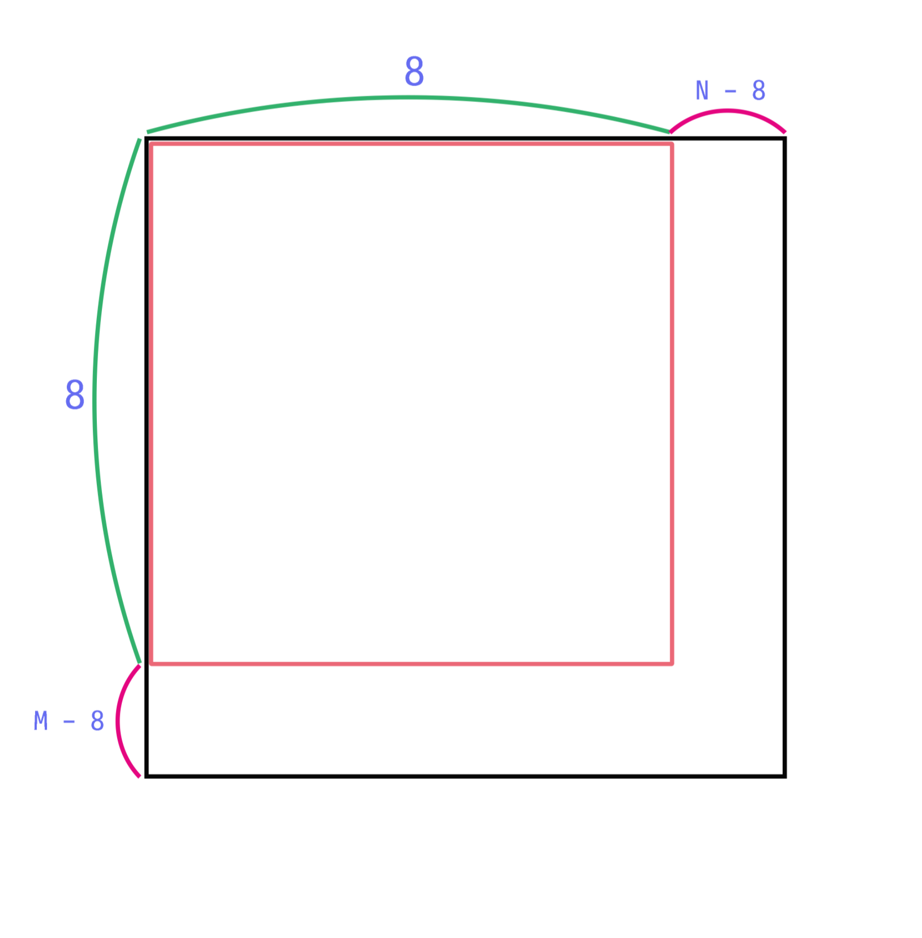 경우의 수는 (가로 칸 개수 - 7) × (세로 칸 개수 - 7) 이다. 그림으로 본다면 대강 아래와 같을 것이다. 최소 크기가 8×8 일 때 경우의 수가 1이기 때문에 각 가로 세로별 길이에 -7 을 해주는 것이다.