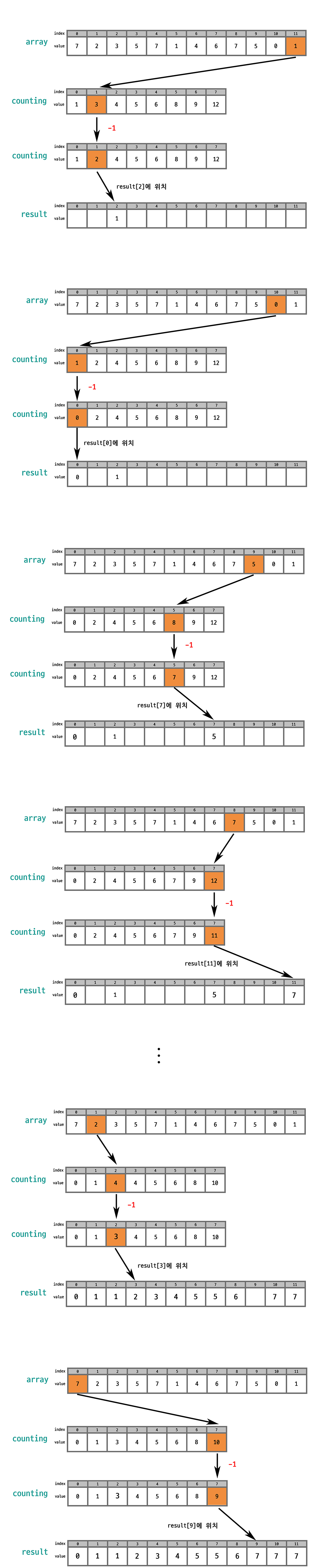 array[0] = 7 이고, counting[7] = 12 이다. 여기서 countin[7] 의 값에 1 을 빼준 뒤 해당 값이 새로운 배열의 인덱스 11에 위치하게 된다.