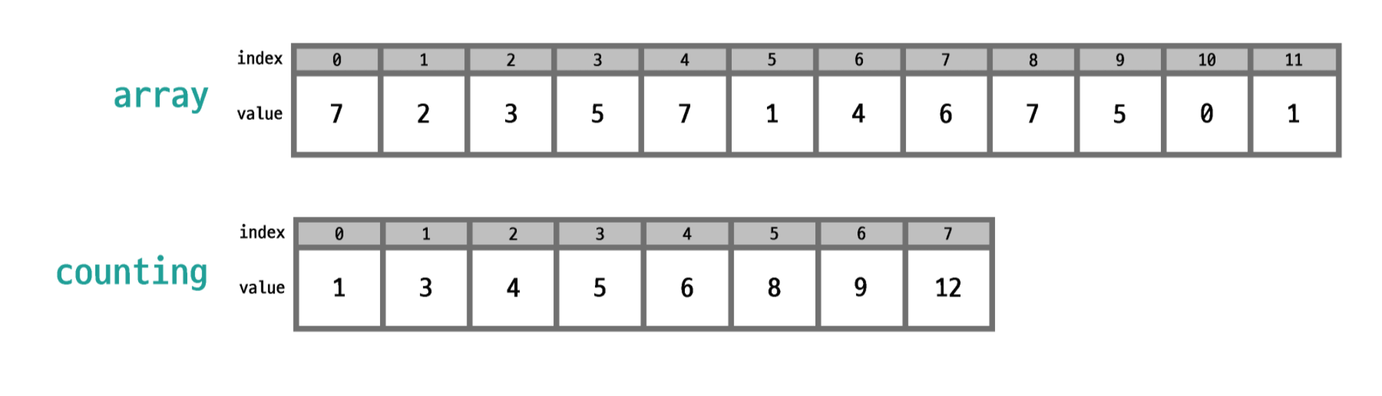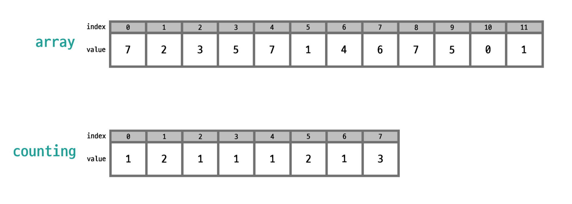 array 를 한 번 순회하면서 각 값이 나올 때마다 해당 값을 index 로 하는 새로운 배열(counting)의 값을 1 증가시킨다.