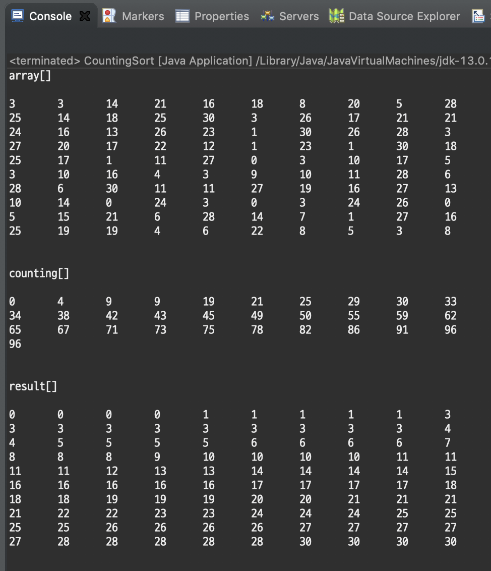 위 코드를 토대로 실행을 해보면 다음과 같이 출력된다. (물론 랜덤값으로 수열을 초기화 했기 때문에 조금씩은 다르나 정렬이 된다는 것을 보여주어야 겠으니..)