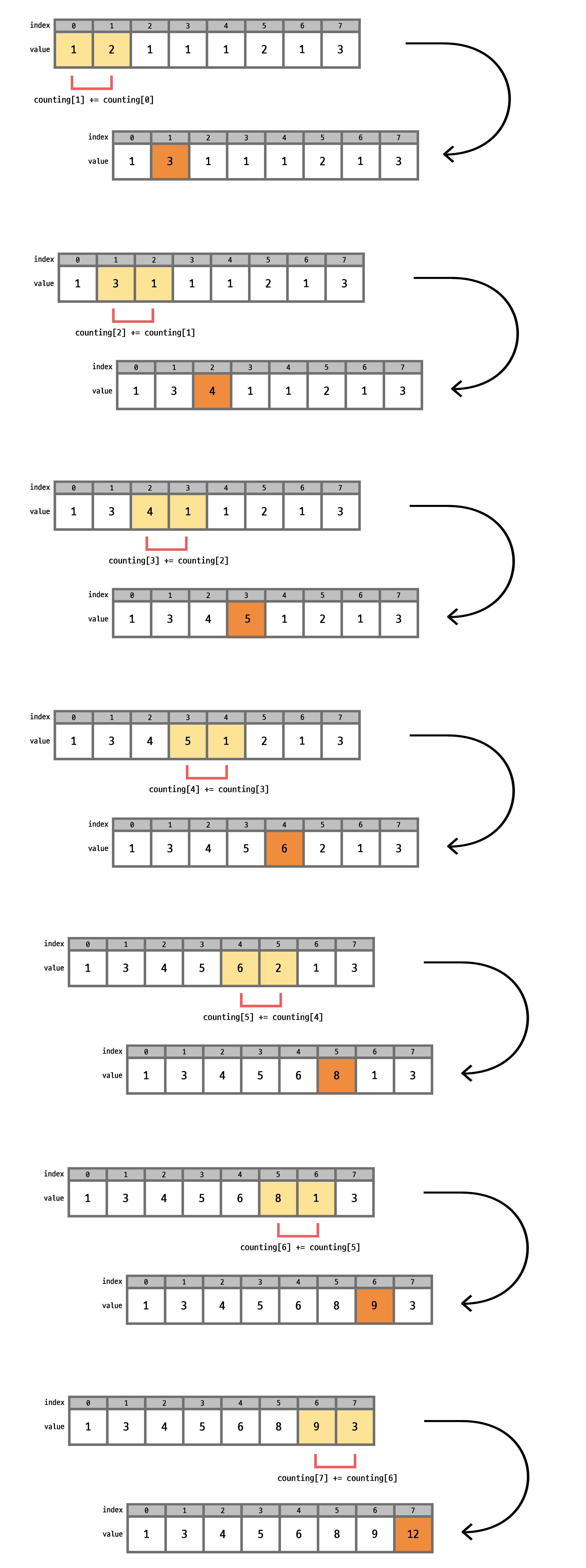 이런식으로 counting 배열은 각 값의 개수가 담겨있는 배열이 된다.