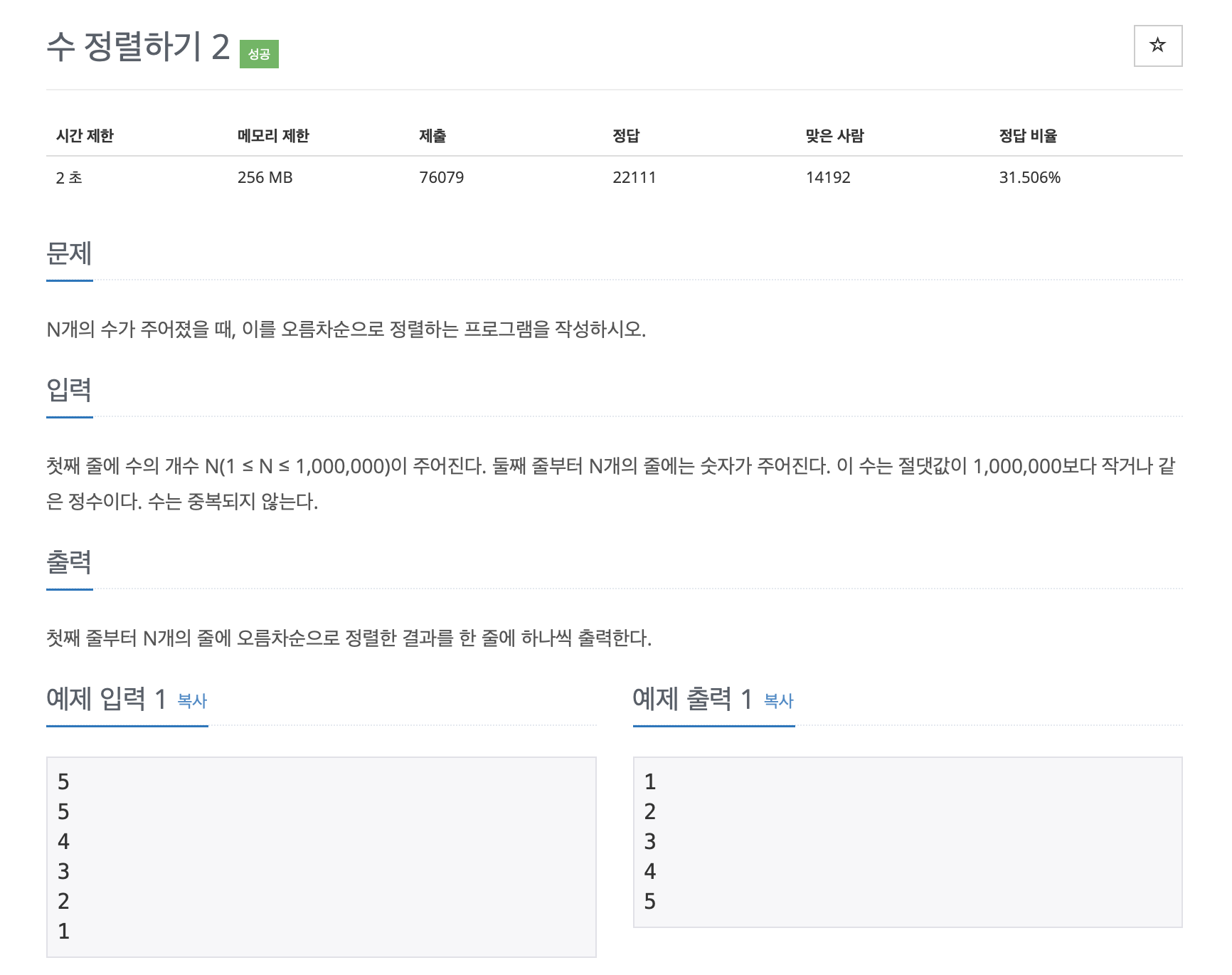 수 정렬하기에 이은 두 번째 문제다. 차이점이라면 데이터도 이전 문제에 비해 1000배 많아졌고, 수의 범위도 1000배 넓다.