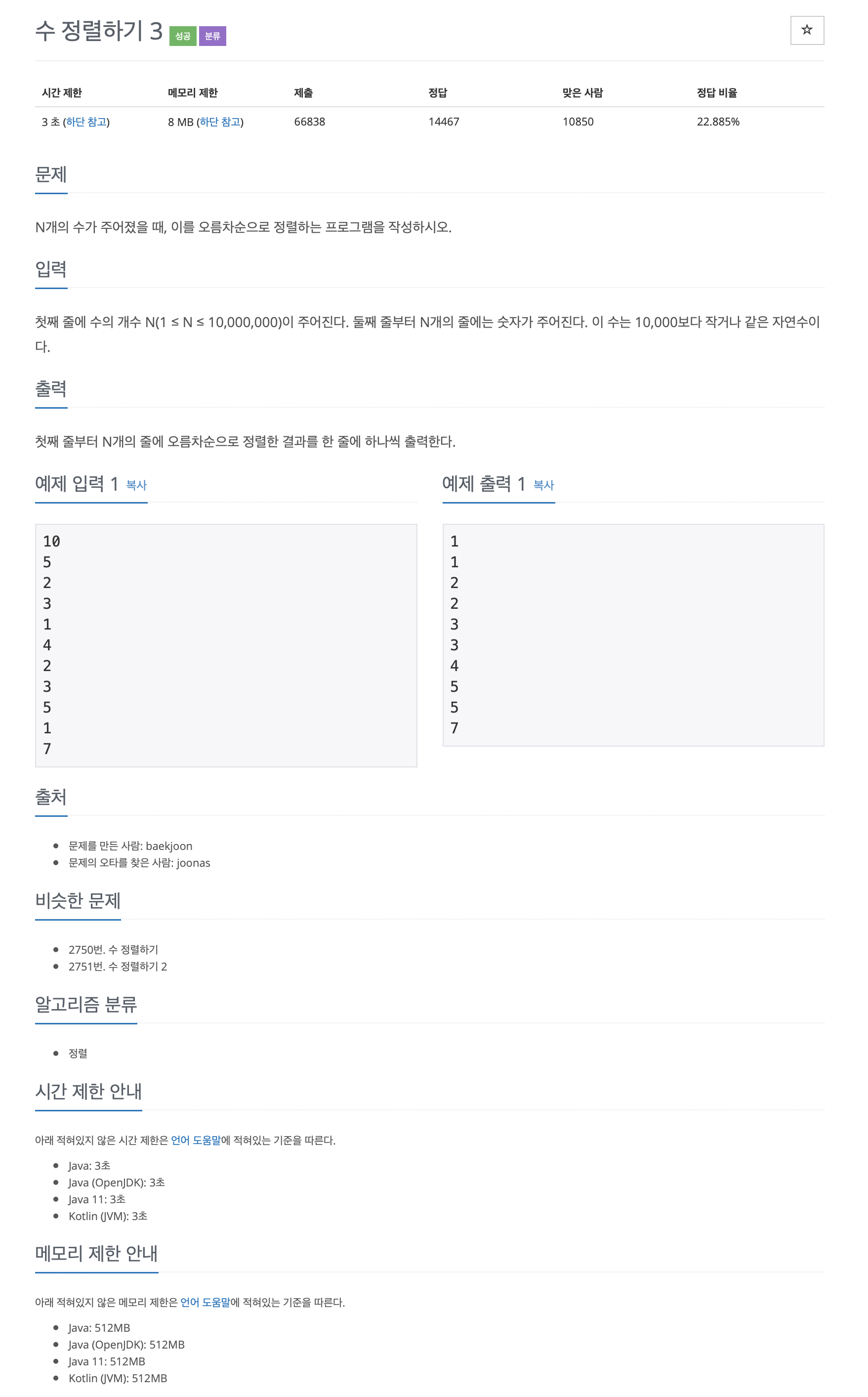 이 번 문제는 카운팅 정렬을 사용하여 푸는 방법을 사용하라고 있는 것이다. 데이터가 천 만개이고, 데이터의 범위는 10,000 보다 작거나 같은 자연수의 데이터들을 일일이 정렬하려면 시간이 엄청나게 빡빡할 수 밖에 없다.
