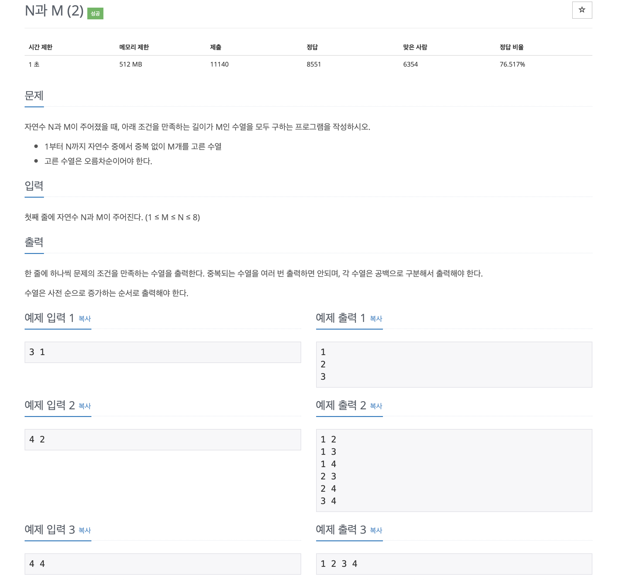 다만 이 문제의 특징이라하면 N과 M을 입력받으면 "1부터 N까지의 수 중 오름차순이면서 M의 길이까지 나열 가능한 수열"이어야 한다. 위 문제에서 예제 입력 3을 보면 알 수 있듯이 4 4 를 입력받으면 1 2 3 4 만 만족한다.