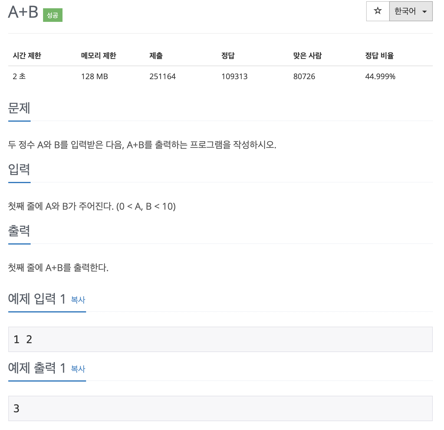 문제 두 정수 A와 B를 입력받은 다음, A+B를 출력하는 프로그램을 작성하시오. 입력 첫째 줄에 A와 B가 주어진다. (0 < A, B < 10) 출력 첫째 줄에 A+B를 출력한다. 예제 입력 1 복사 1 2 예제 출력 1 복사 3 힌트 여기를 누르면 1000번 예제 소스를 볼 수 있습니다....