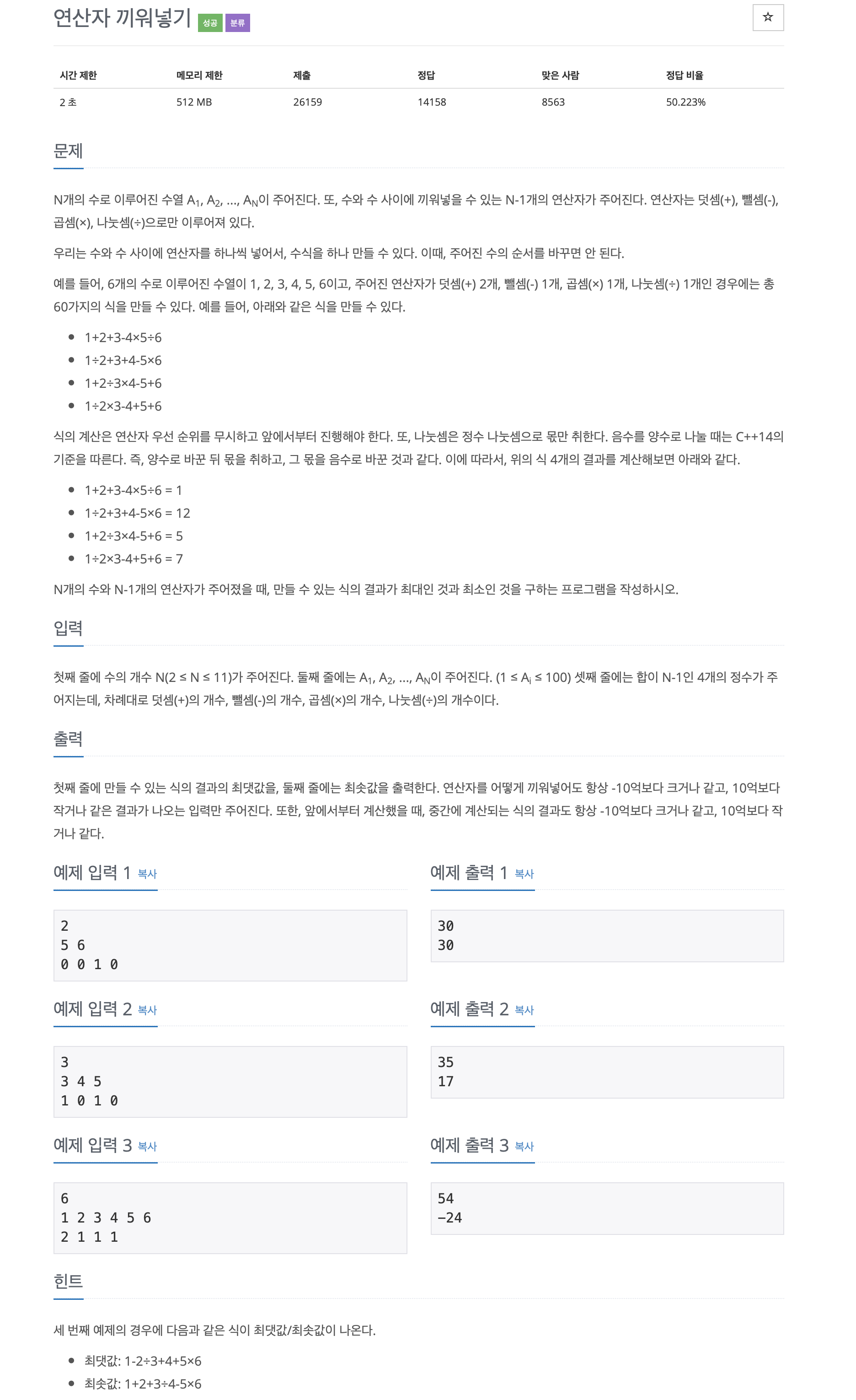 그리고 저 재귀호출과정에서 만약 모든 연산자를 썼을 경우(idx == N) 해당 값이 최대인지, 최소인지를 판별하면 된다.