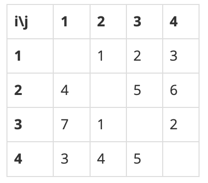 [5(S12 + S21), 7(S34 + S43)], [9(S13 + S31), 10(S24 + S42)], [6(S14 + S41), 6(S23 + S32)]