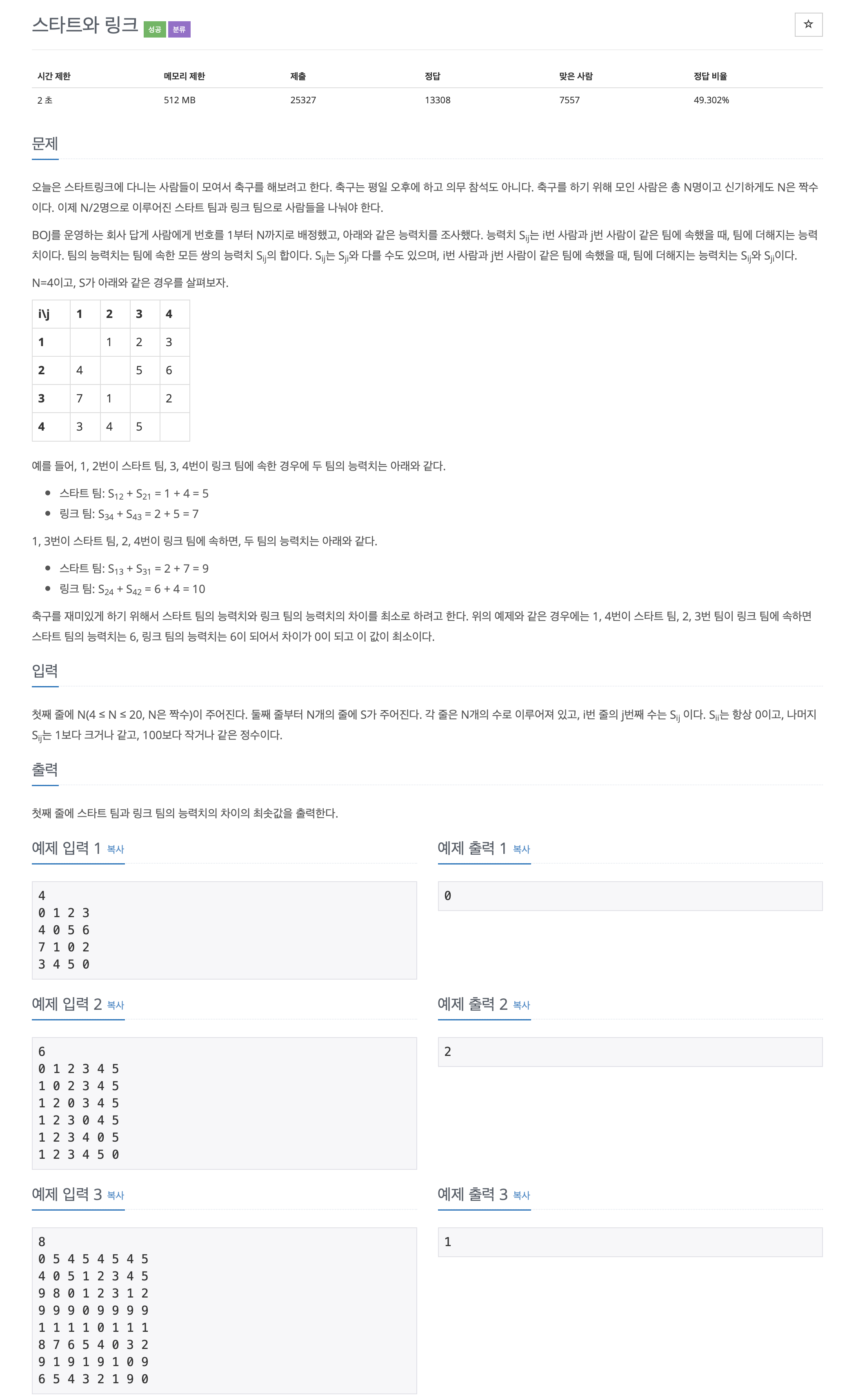 저번 연산자 끼워넣기에 이어 이번 문제도 백준에서 제공하는 삼성 SW 역량 테스트 기출문제 중 하나다. 이 문제의 포인트는 두 팀으로 나누는데, 각 팀의 능력치 차이를 최소화 한다는 것이다. 한마디로 팀의 전력차가 적게 나도록 팀을 짜면 된다.