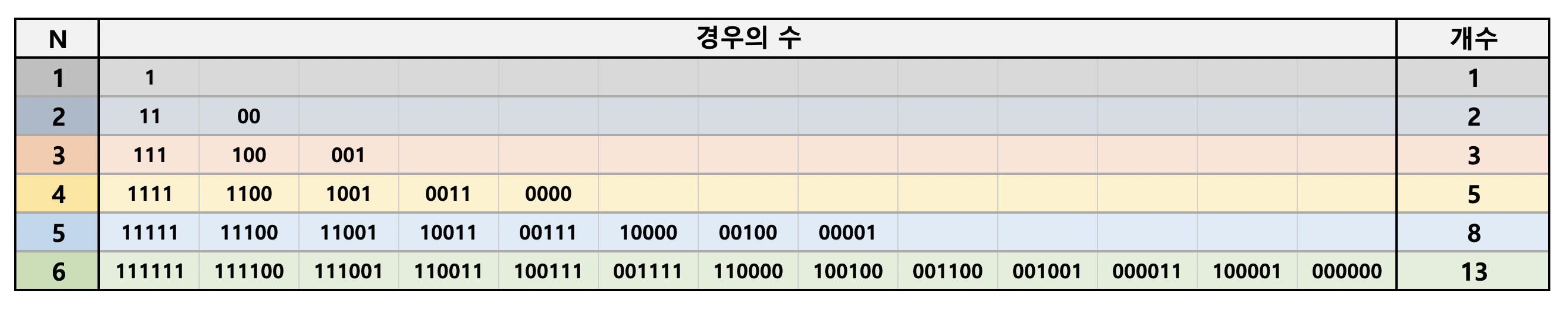 N=6까지 가능한 경우의 수들을 나열해보았다.