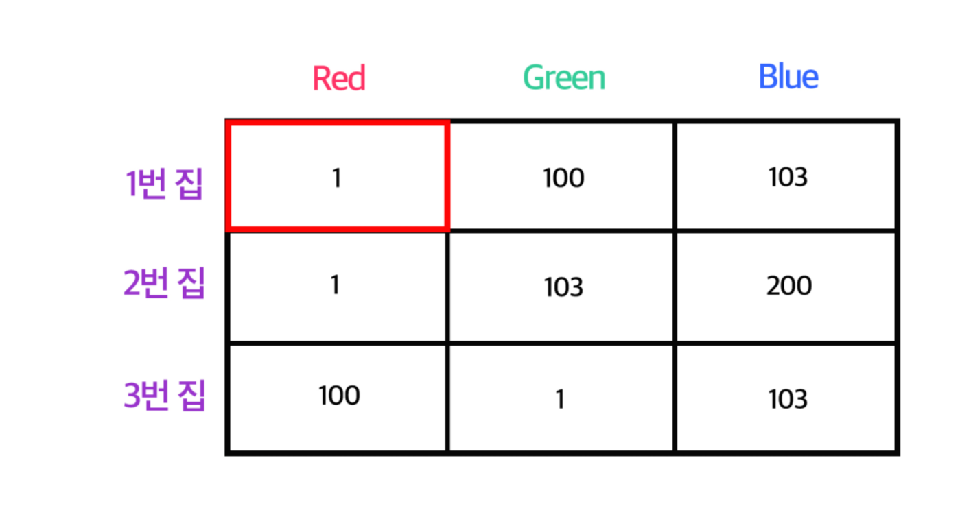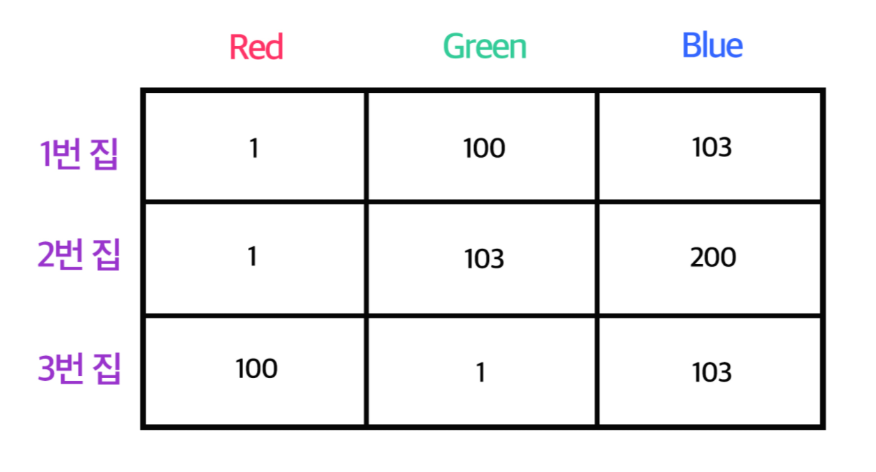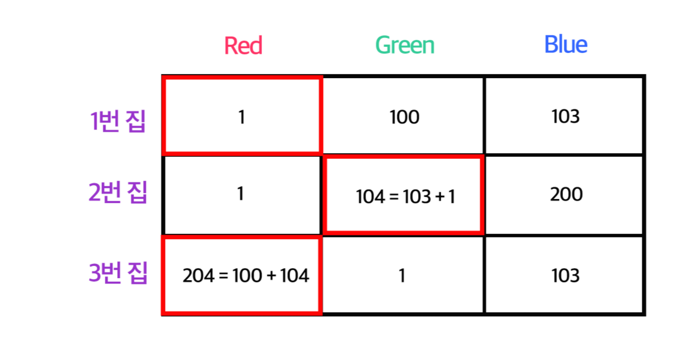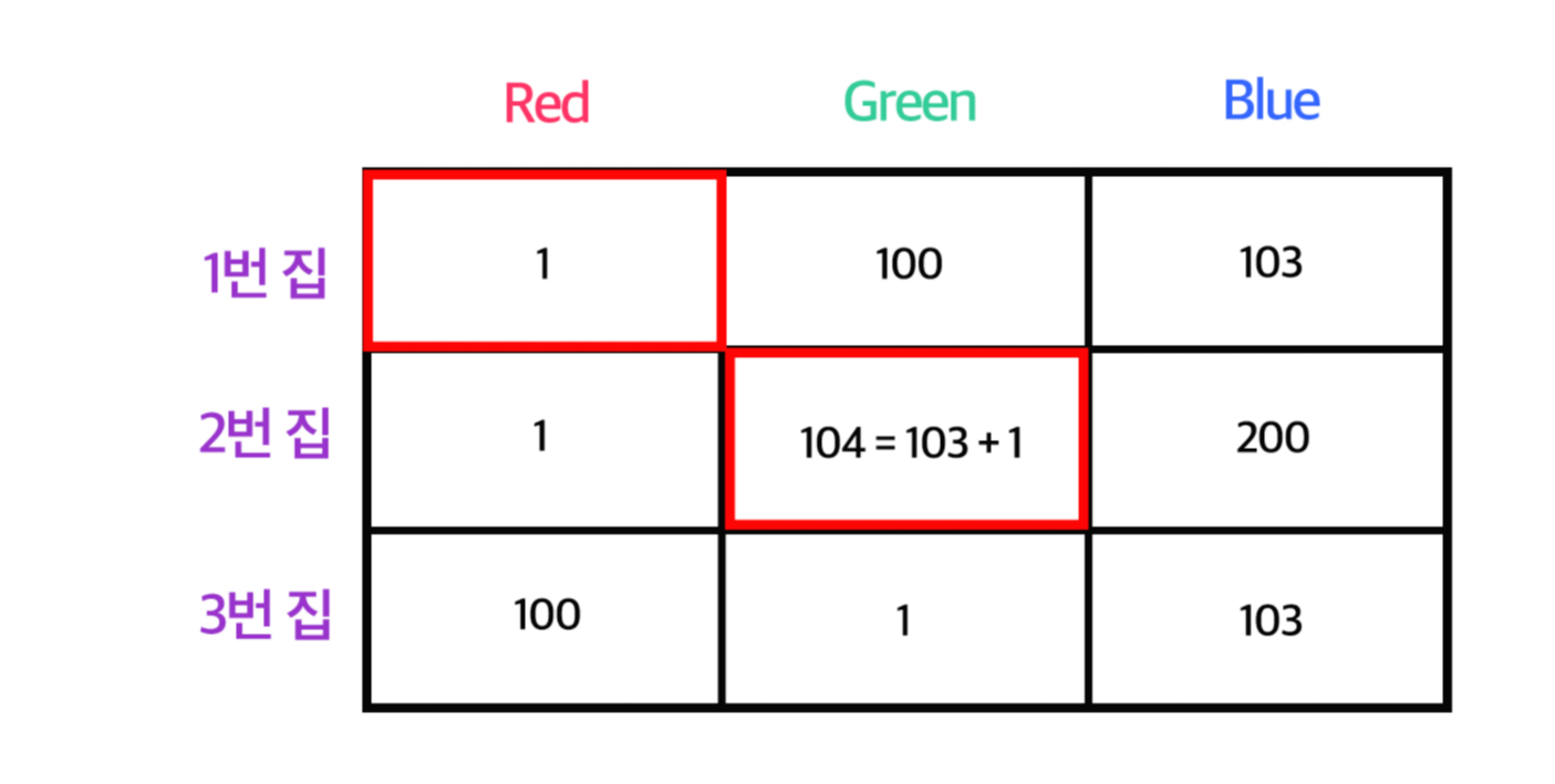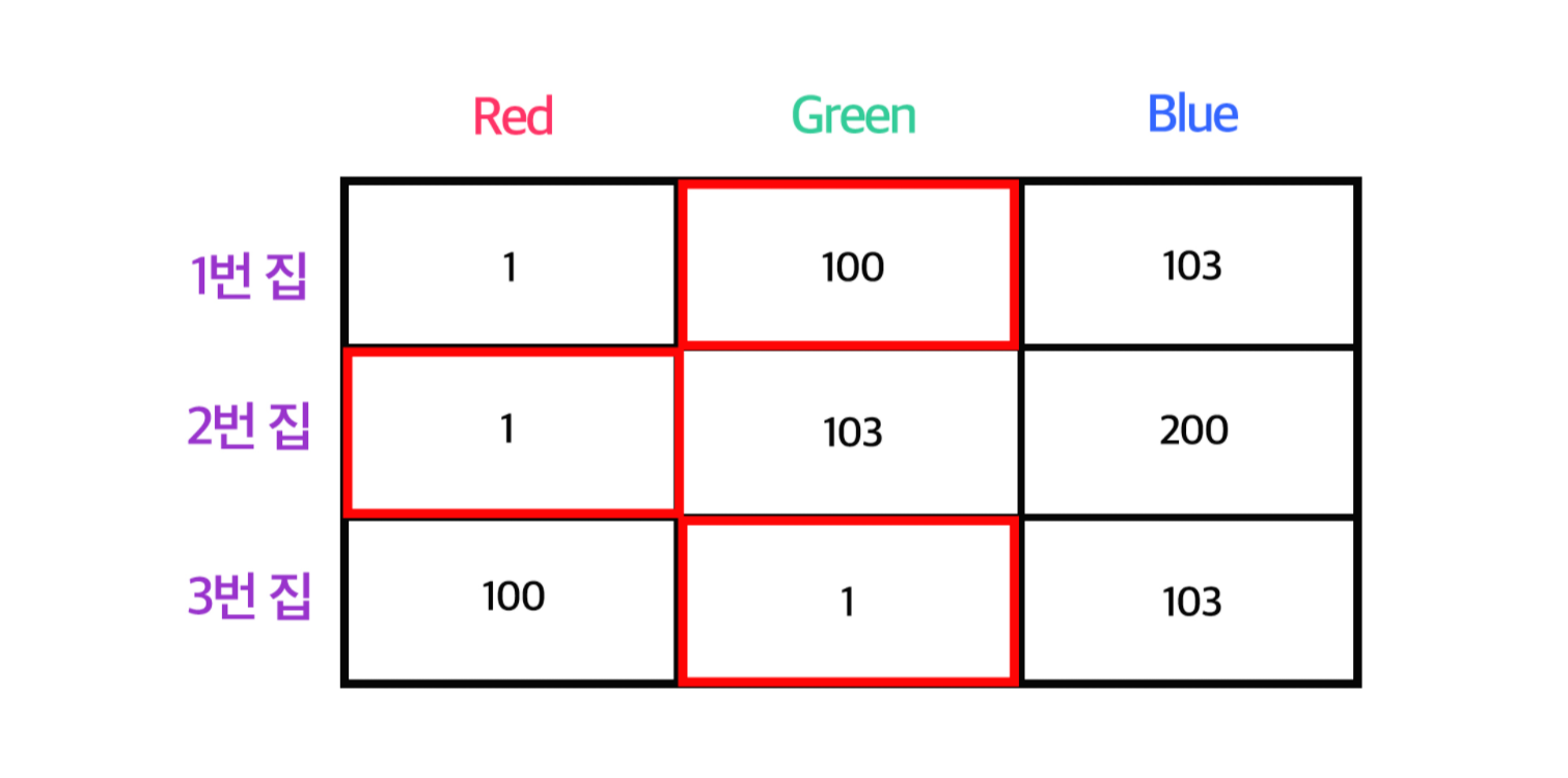 사실 정답은 100(1번집 Green) + 1(2번집 Red) + 1(3번집 Green)인 102가 정답이다. 즉 각 집별 최솟값이 아닌 아래 그림과 같은 빨간색 칸을 선택해야 올바른 정답이 된다.