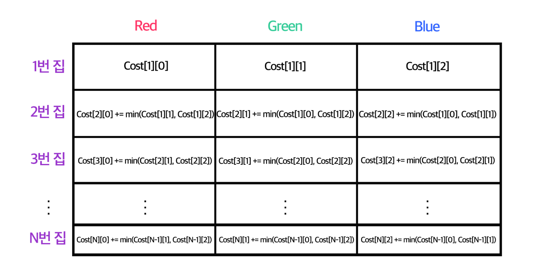 일단 각각의 집을 색칠해야하고, 색의 종류는 3가지가 주어진다 (빨간색, 초록색, 파란색). 그리고 각 집마다 해당 색을 칠하는 비용이 주어진다. 그리고 전체 집을 색칠 할 때 최소 비용을 구하는 것이다.