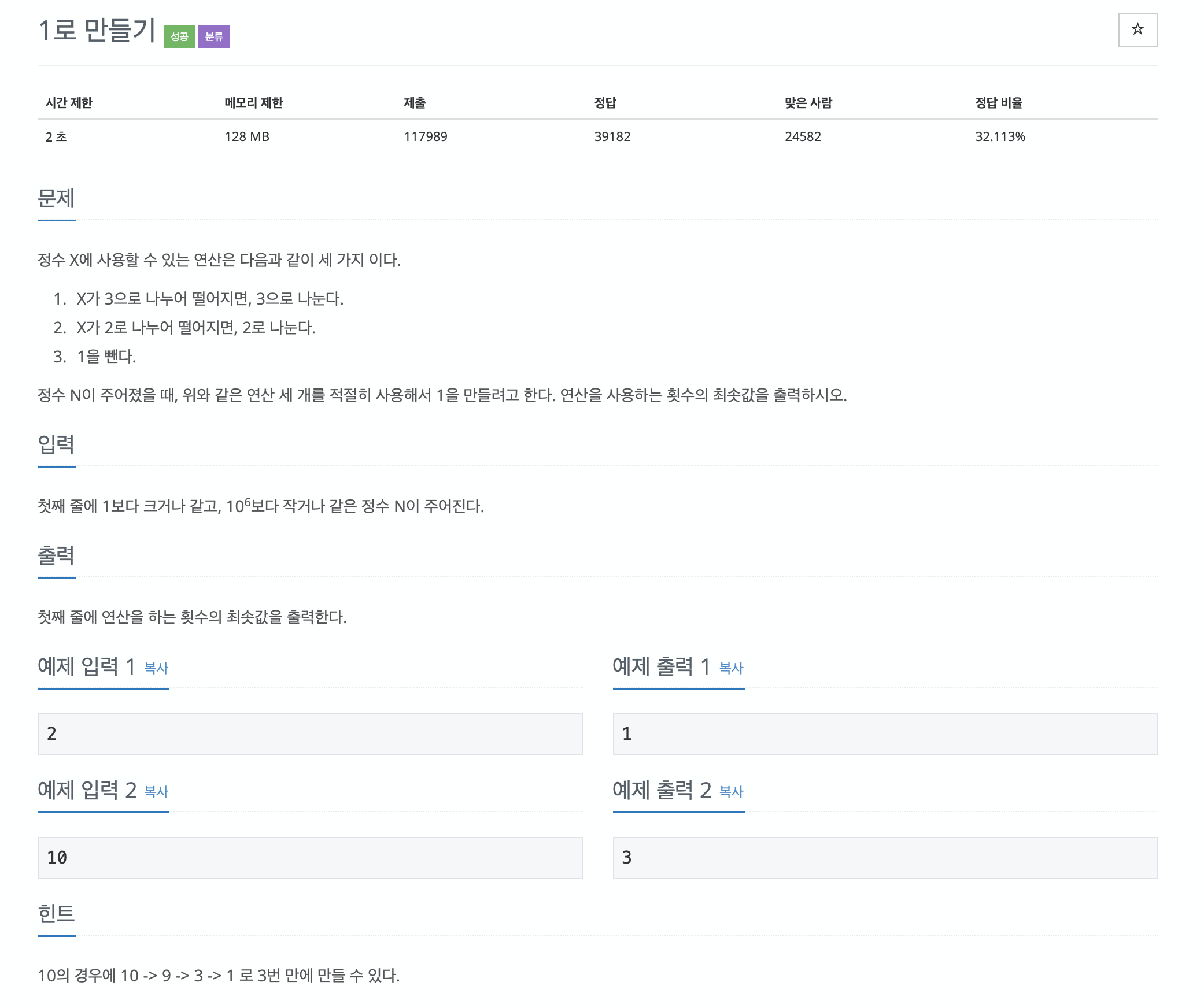 즉, 6으로 나눠지는 경우는 3으로 나누는 경우와 2로 나누는 경우, 1을 빼는 경우 모두 재귀호출 하여 3가지 경우 중 최솟값으로 DP를 갱신해야 하고, 3으로만 나눠지는 경우는 3으로 나누는 경우와 1을 빼는 경우를 재귀호출, 2로만 나눠지는 경우는 2로 나누는 경우와 1을 빼는 경우의 수를 재귀호출, 그 외에는 1을 빼는 경우만 재귀호출을 해주면 된다.