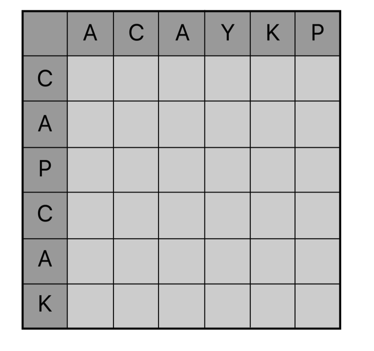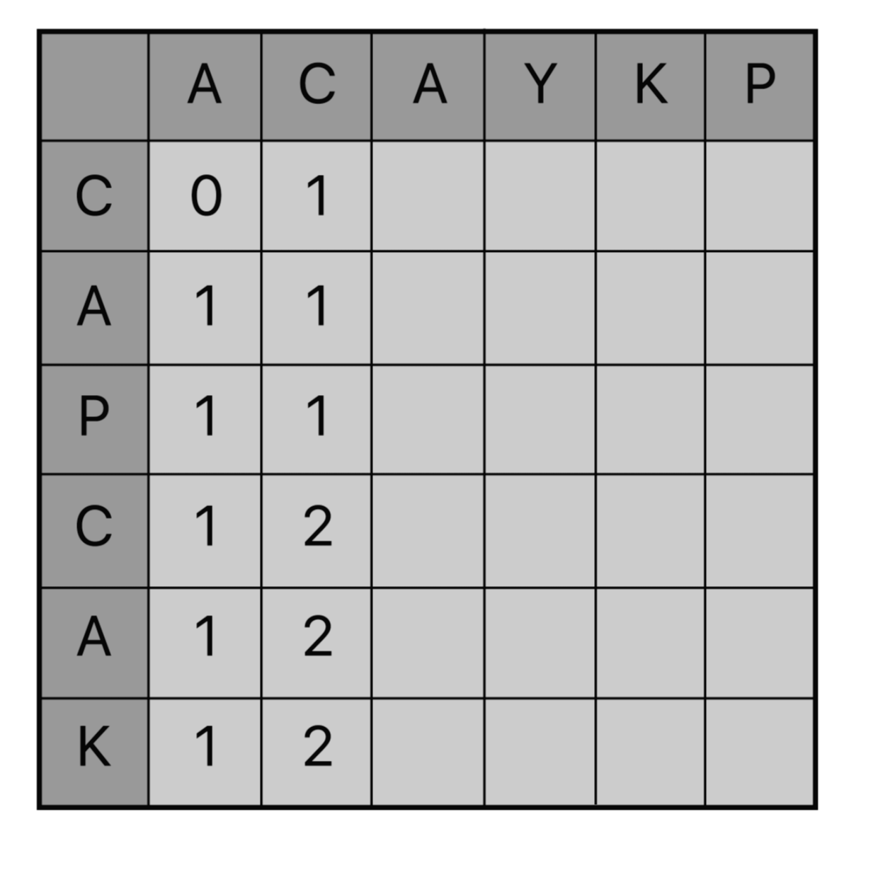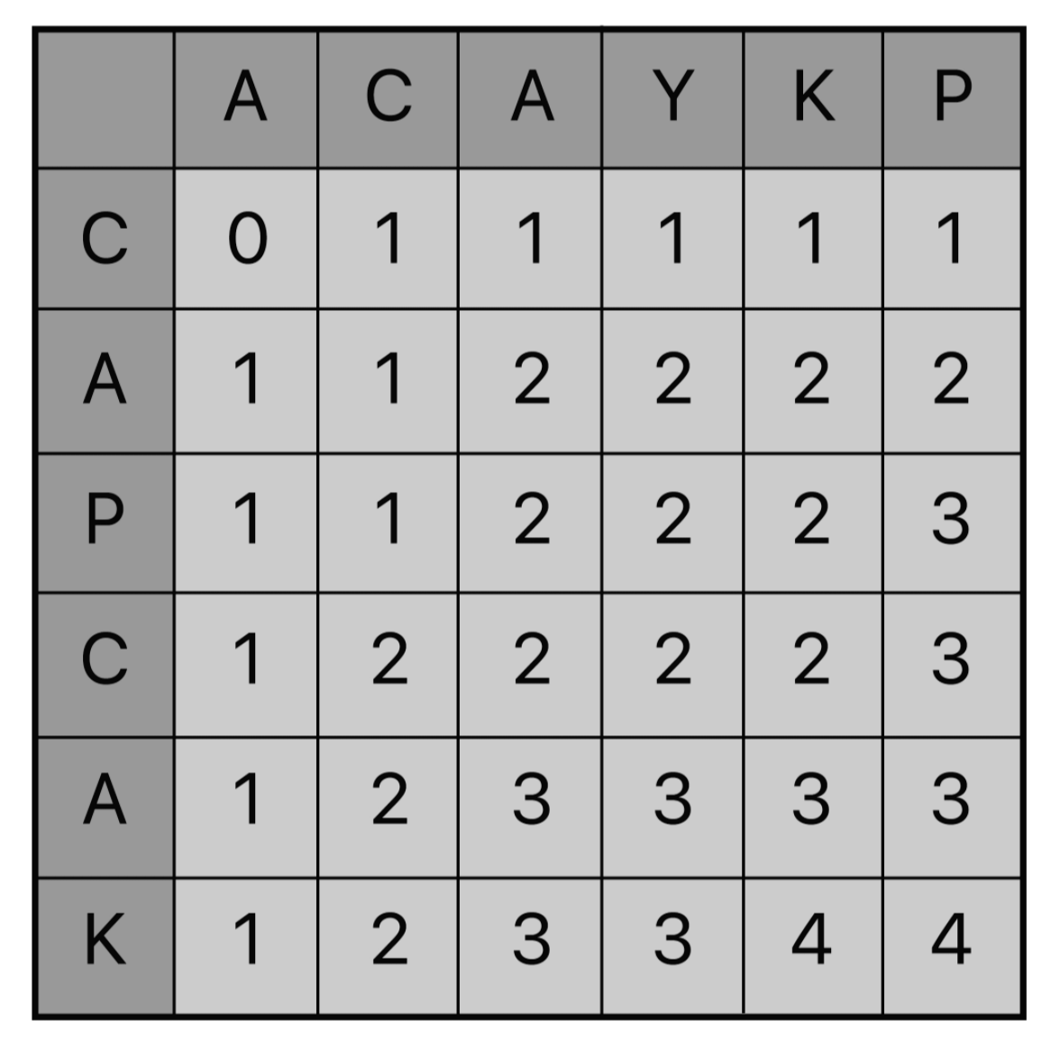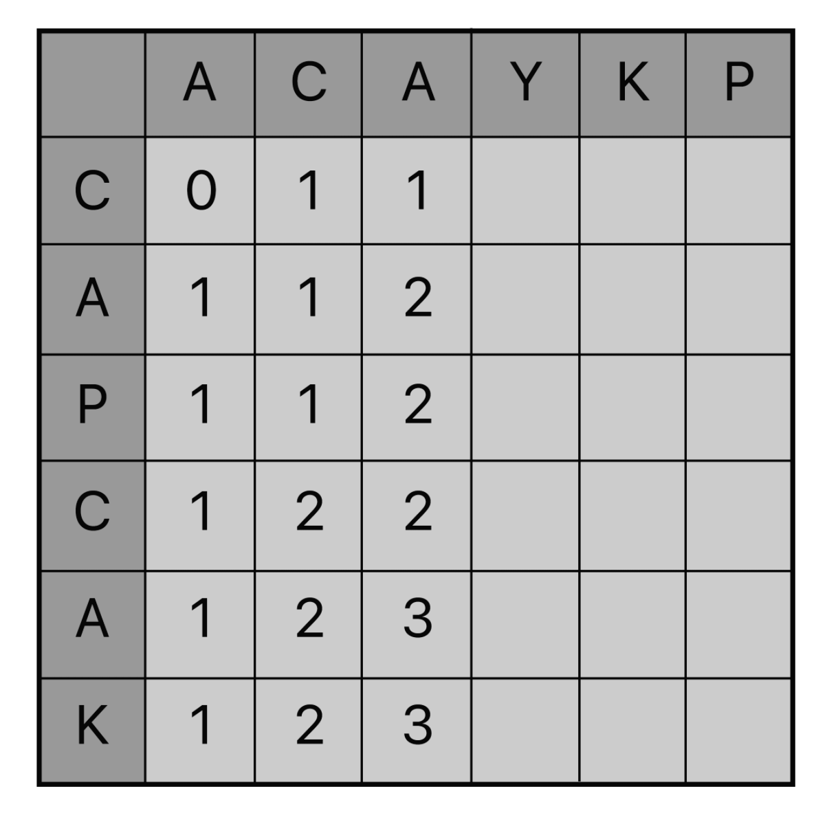 {C} 와 {A, C}의 부분수열은 {C} 이고, 두 번째 C에서는 {C, A, P ,C} 와 {A, C}의 부분 수열은 {A, C}로 +1이 증가한다. 또 한 번 채워볼까.