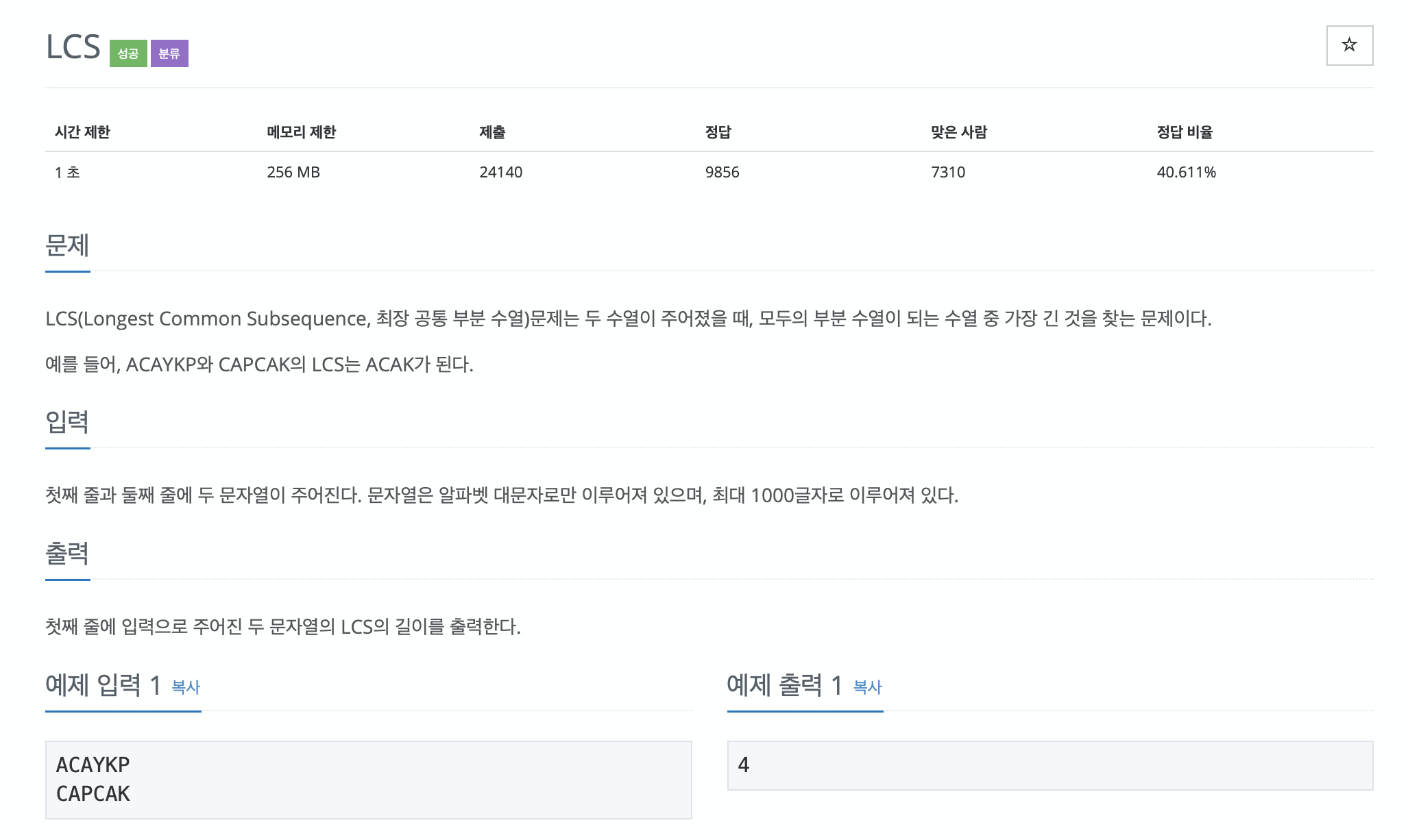 LCS(Longest Common Subsequence, 최장 공통 부분 수열)문제는 두 수열이 주어졌을 때, 모두의 부분 수열이 되는 수열 중 가장 긴 것을 찾는 문제이다. 예를 들어, ACAYKP와 CAPCAK의 LCS는 ACAK가 된다.