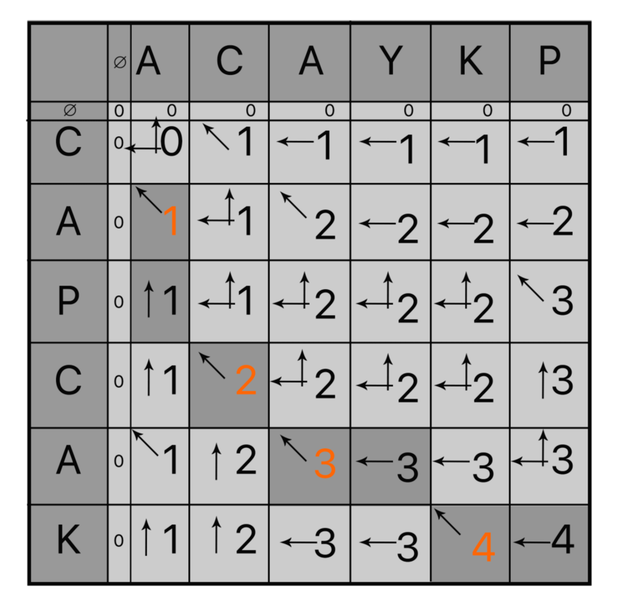 예로들어 그림에서 (0, 1)을 보자. 이 인덱스는 {C}, {A, C}의 LCS길이를 의미하는 것이고 이는 {C}로 길이는 1이다.