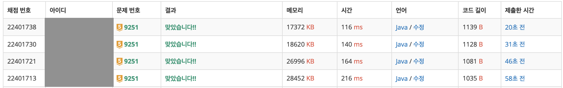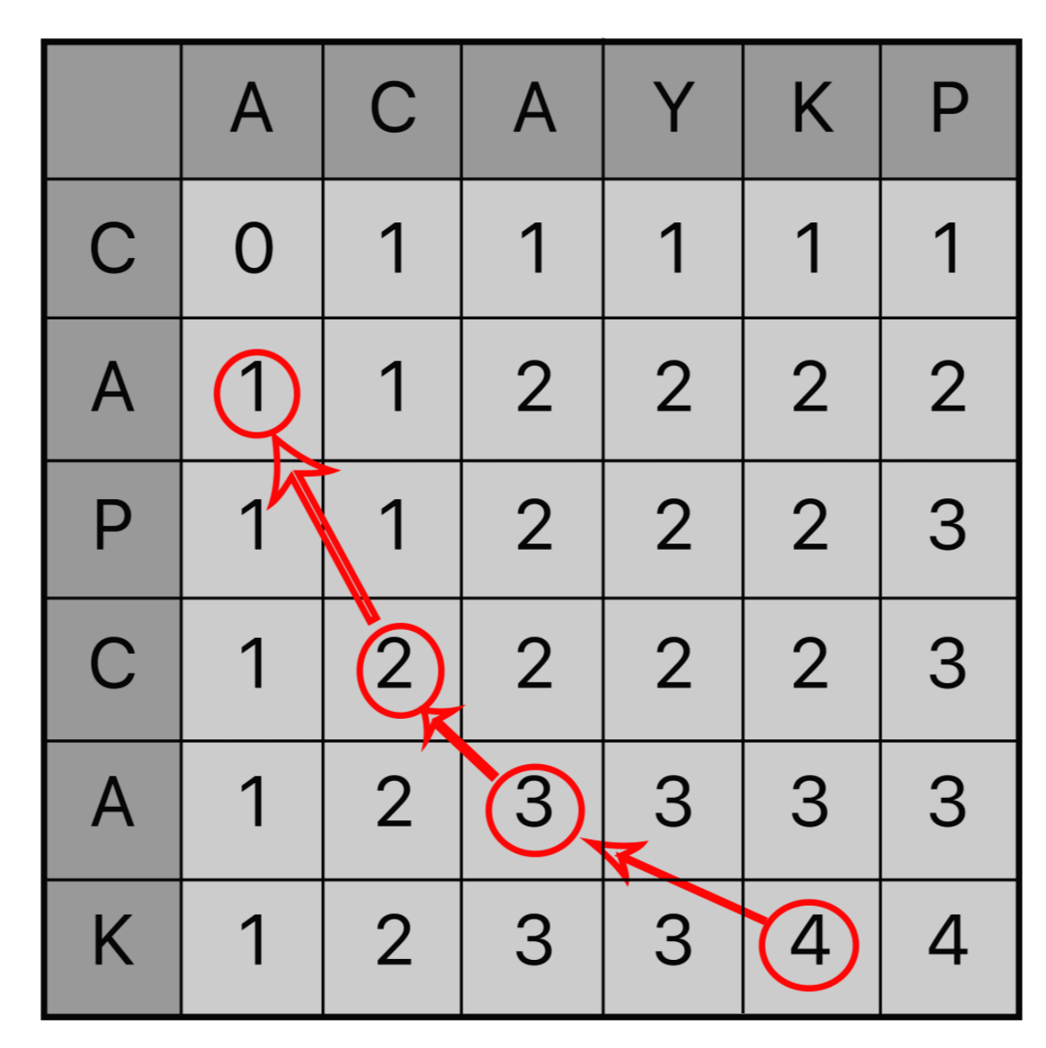 위 예시로는 위와 같이 {A,C,A,K} 가 가장 긴 부분수열이 된다.