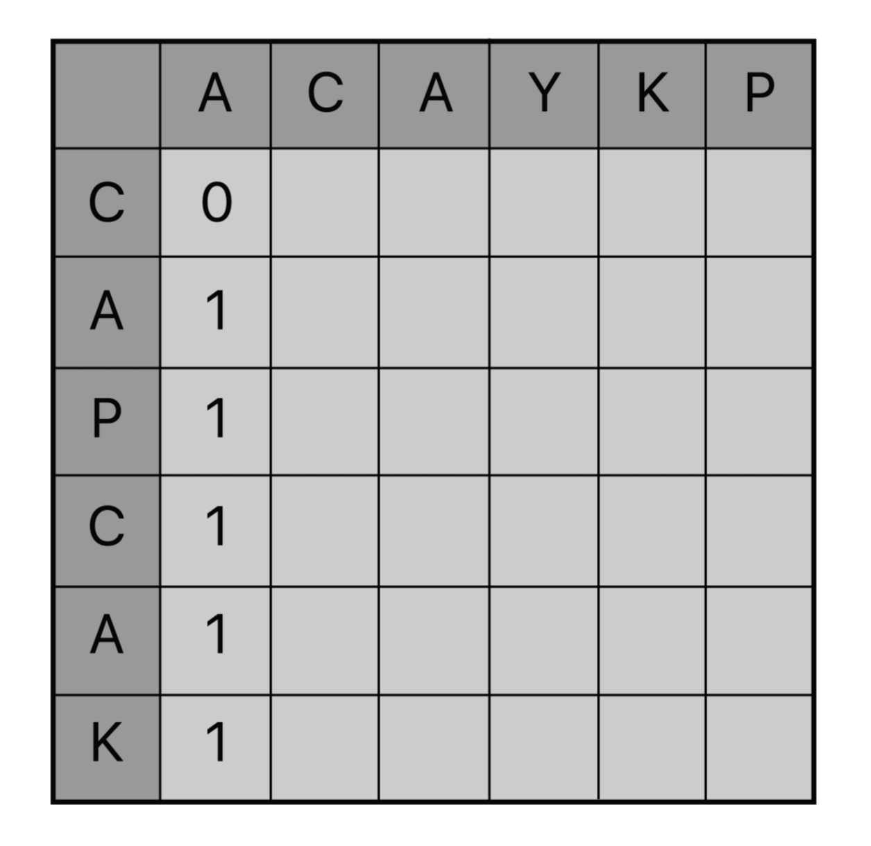 여기서 잘 고민해야 할 부분이 [A, A] 의 경우 {C, A} 와 {A}의 LCS 길이를 의미한다. 예로들어 [K, A] 의 경우 {C, A, P, C, A, K} 와 {A}의 LCS길이라는 것이다. 즉 두 번째 A가 오더라도 +1 더하는 것이 아니라 {C, A, P, C, A} 와 {A}의 최장 부분수열은 {A} 하나 뿐이므로 1이 된다.