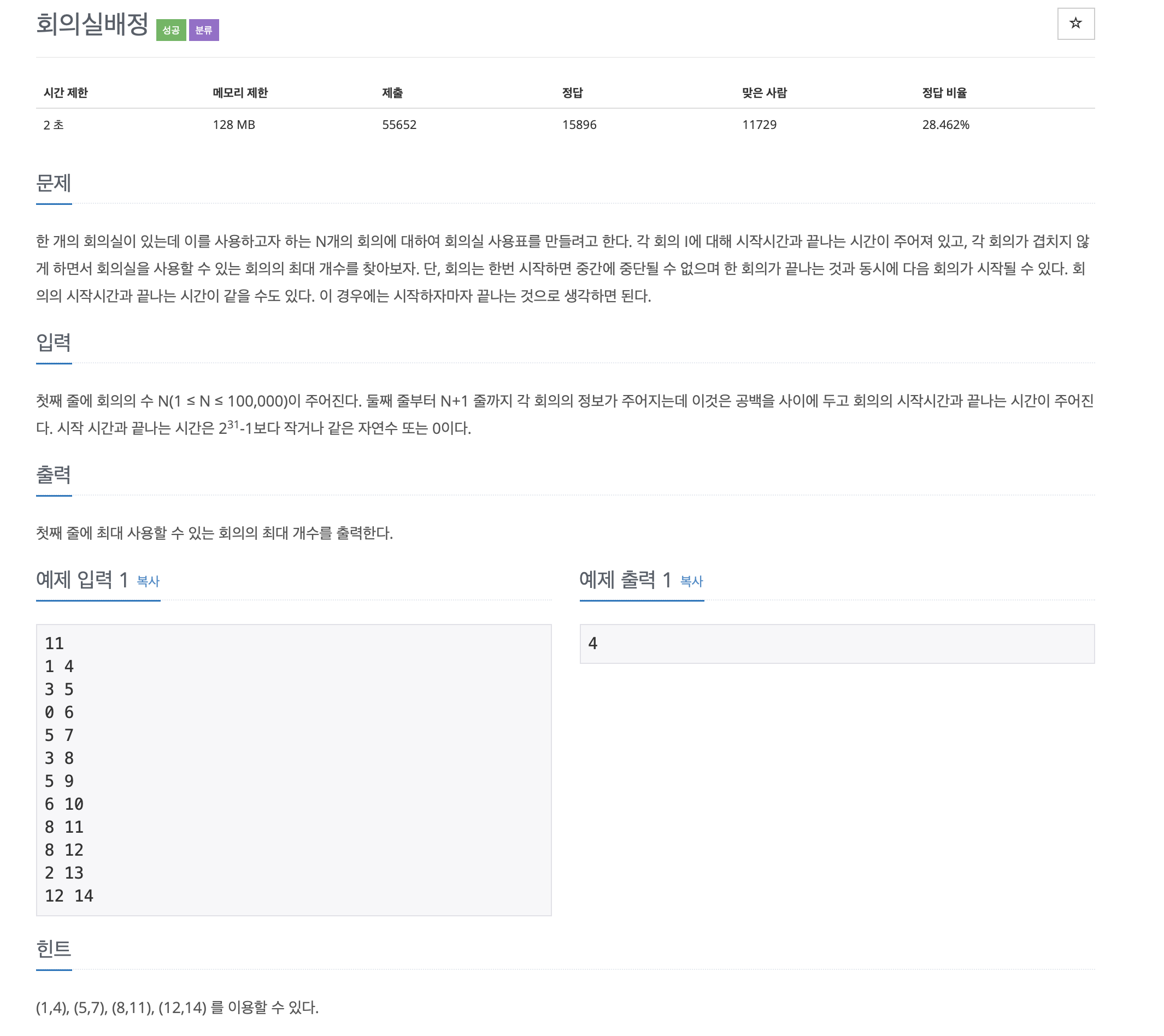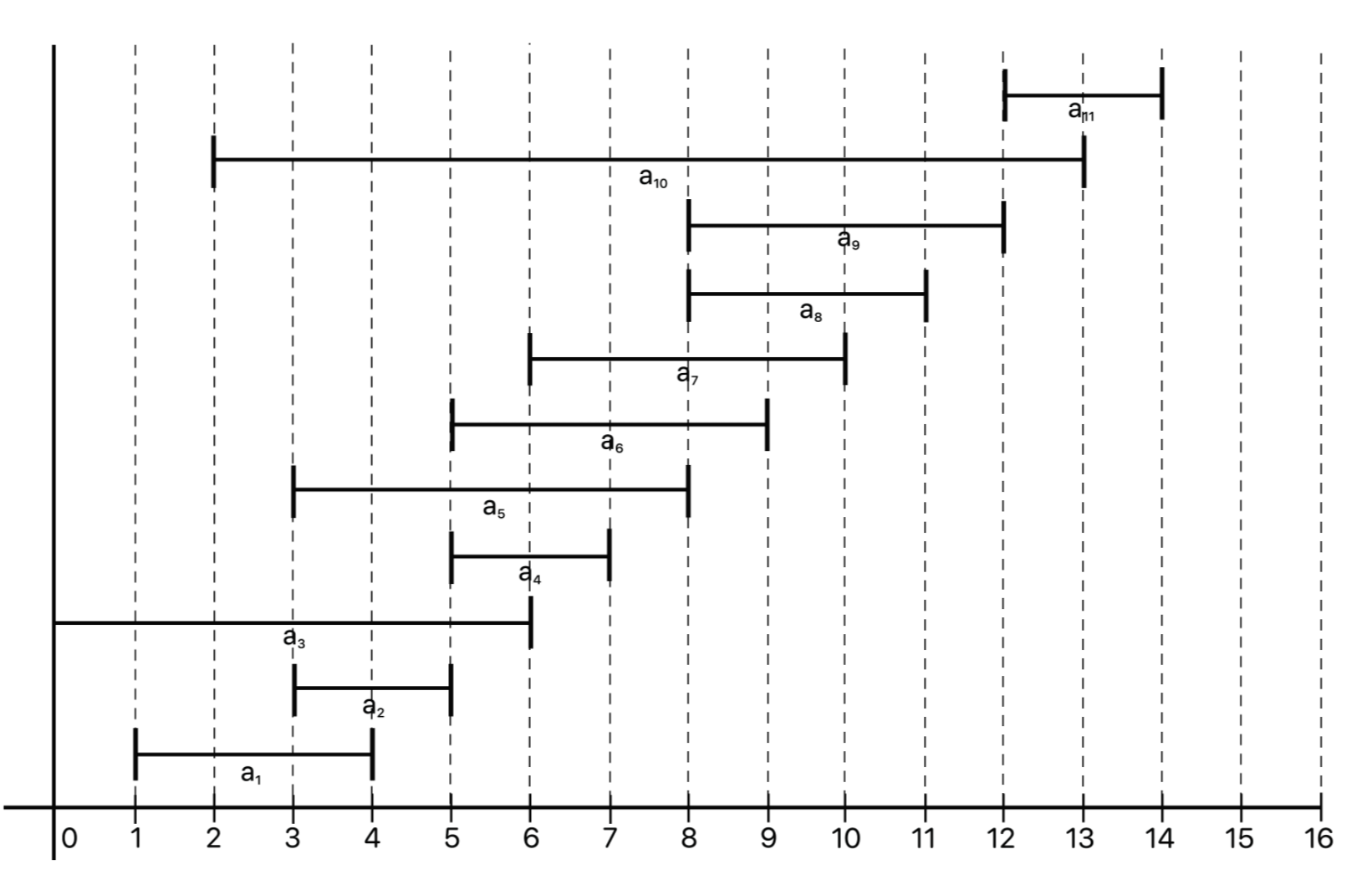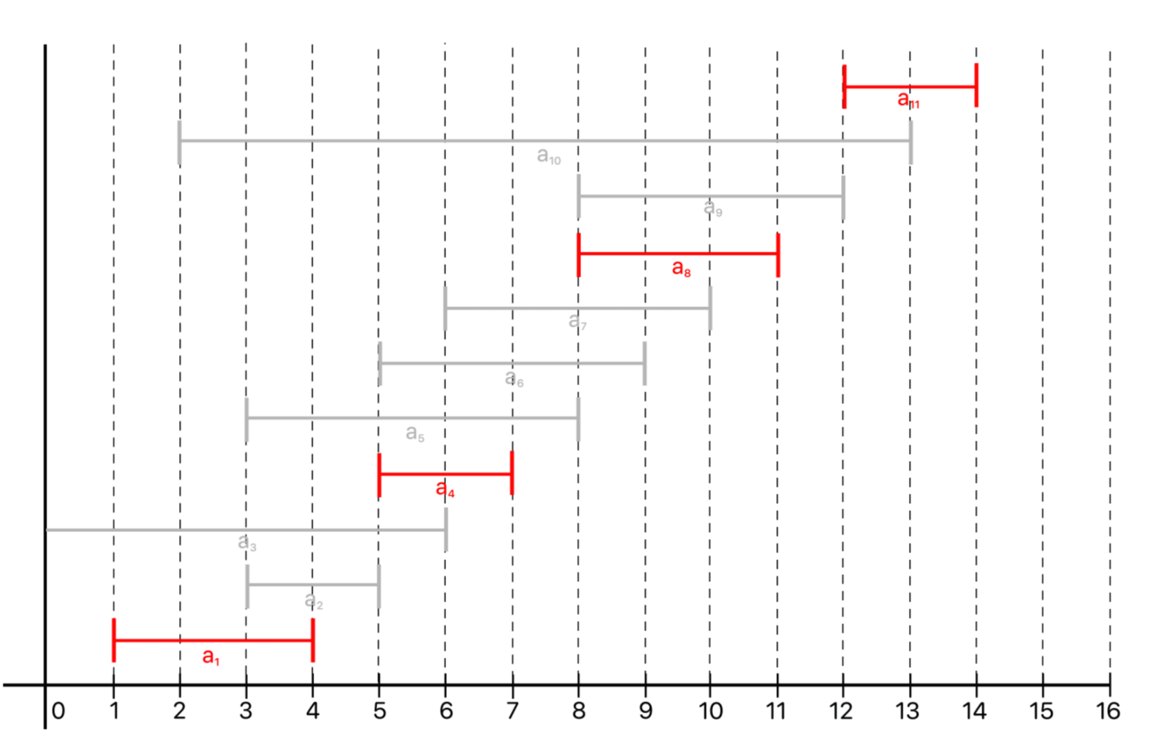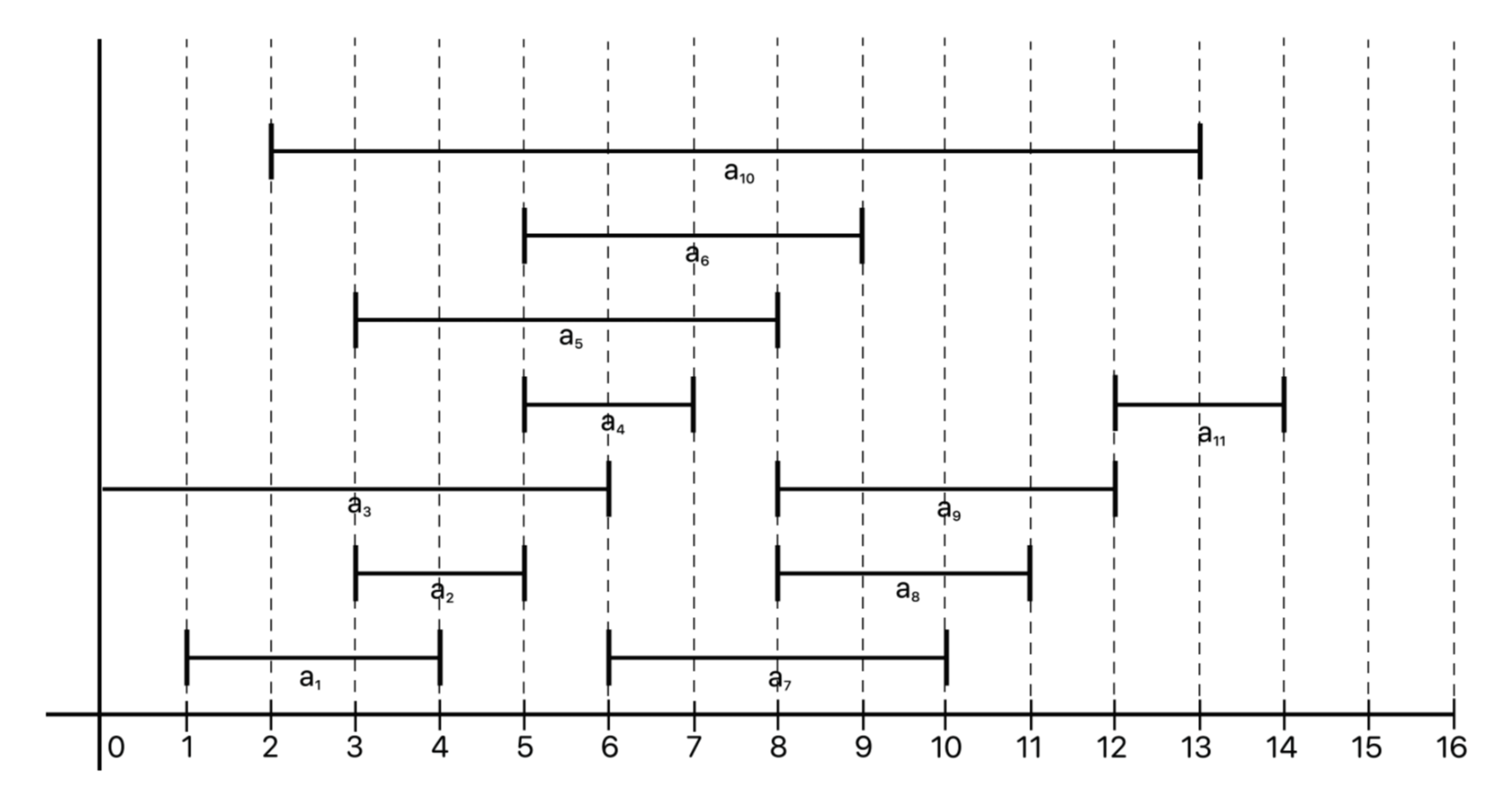 이렇게 a1 (1, 4), a4 (5, 7), a8 (8, 11), a11 (12, 14) 가 선택되므로 최대 회의 가능한 수는 4가 된다.