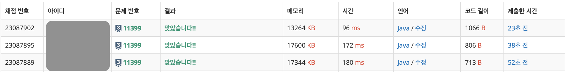 앞서 포스팅 했던 문제인 회의실배정과 유사한 문제다. 문제를 잘 이해해야 하는 것이 '종료 시간'이 아니라 '대기 시간의 총합'을 구하는 문제라는 점. 즉, 어떻게 배치하던 총 걸리는 같더라도, 한 사람이 대기하는 시간은 달라질 수 있다.