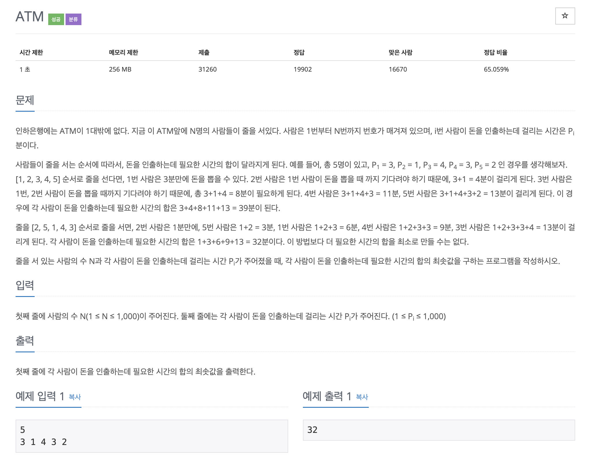 상식적으로 대기시간을 줄이려면 앞 사람이 일찍 끝내야 그만큼 대기시간을 줄일 수 있다. 그리고 각각의 사람이 돈을 인출할 때에는 다른 사람이 개입할 수 없으므로 그리디 알고리즘의 조건인 독립성과 전체 최적해가 부분 최적해를 만족함 둘 다 만족한다.