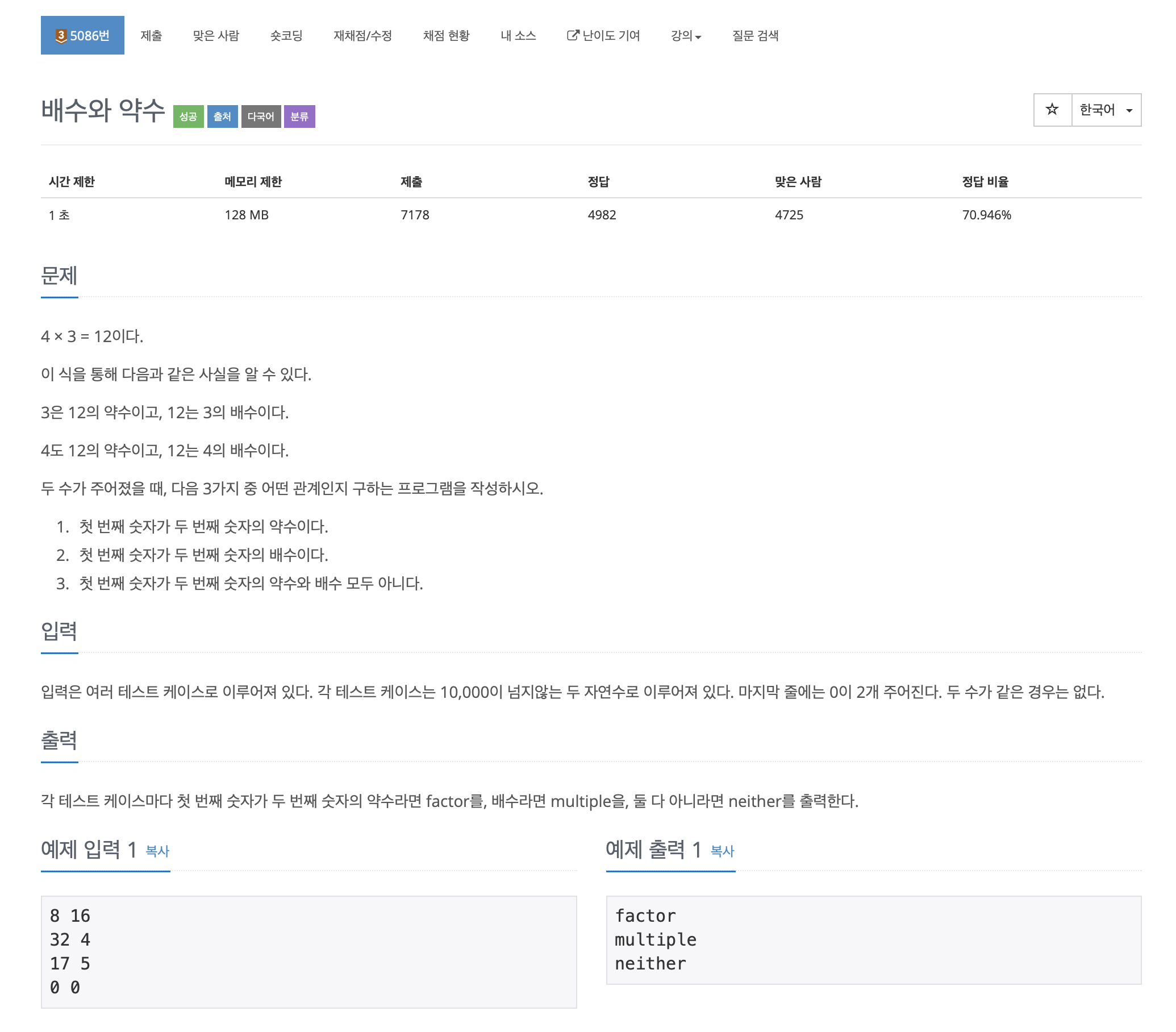 각 테스트 케이스마다 첫 번째 숫자가 두 번째 숫자의 약수라면 factor를, 배수라면 multiple을, 둘 다 아니라면 neither를 출력한다.
