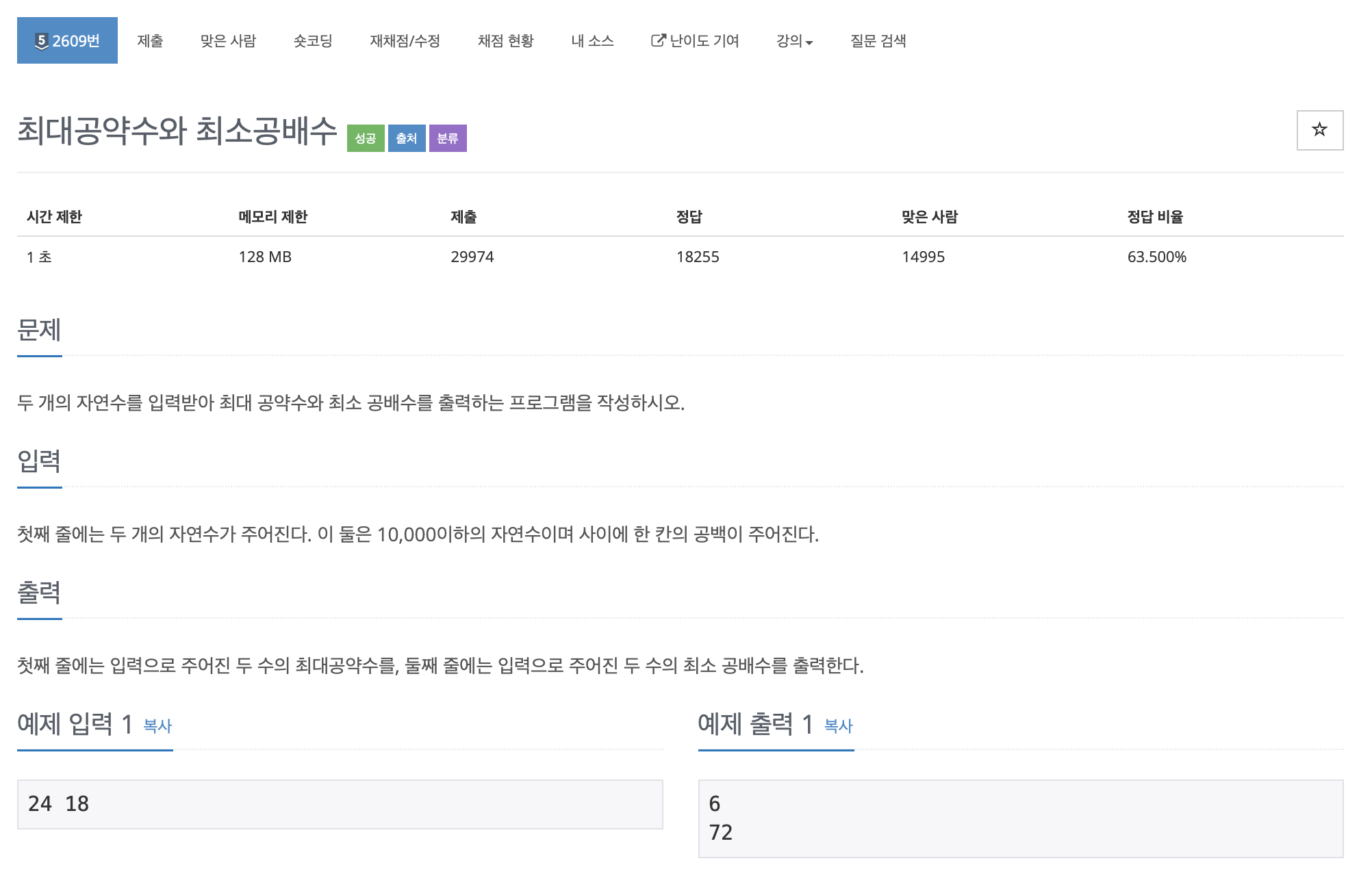 [백준] 2609번 : 최대공약수와 최소공배수 - JAVA [자바]