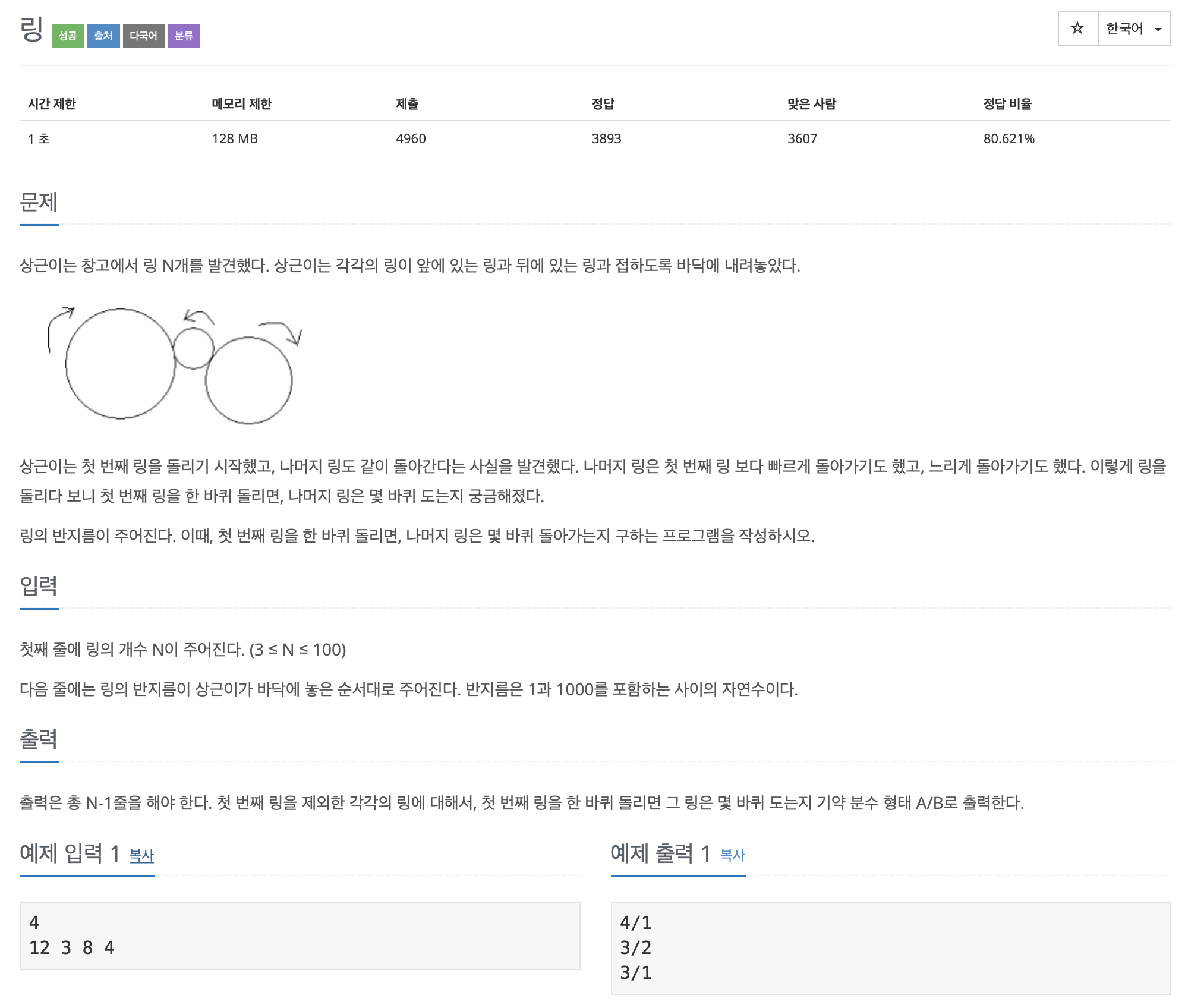 위 예제를 보면 첫 번째 링의 반지름이 12이고, 이 링이 한 바퀴 돌 때 나머지 링이 몇 바퀴가 도는지를 '기약 분수'로 출력하는 문제다.