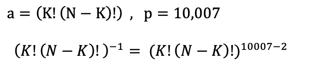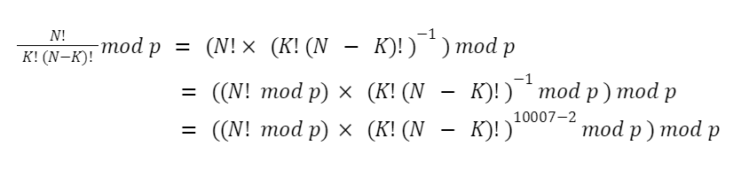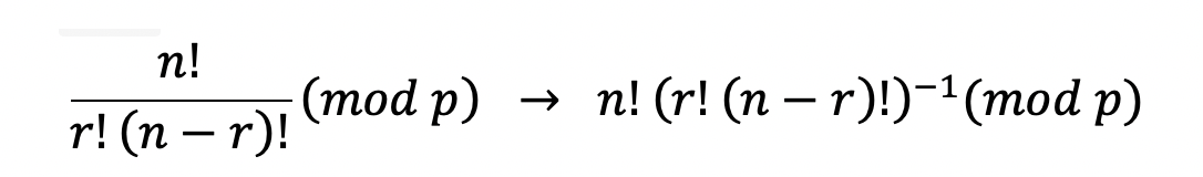 문제에서 p = 10007 이였고, 지금 우리가 구하고자 하는 역원은 ( r!(n-r)! ) 에 대한 역원 이다. 이 것을 그대로 나누는 수 p도 소수이니 이 두 식을 위 공식에 그대로 적용하자면 이렇다.