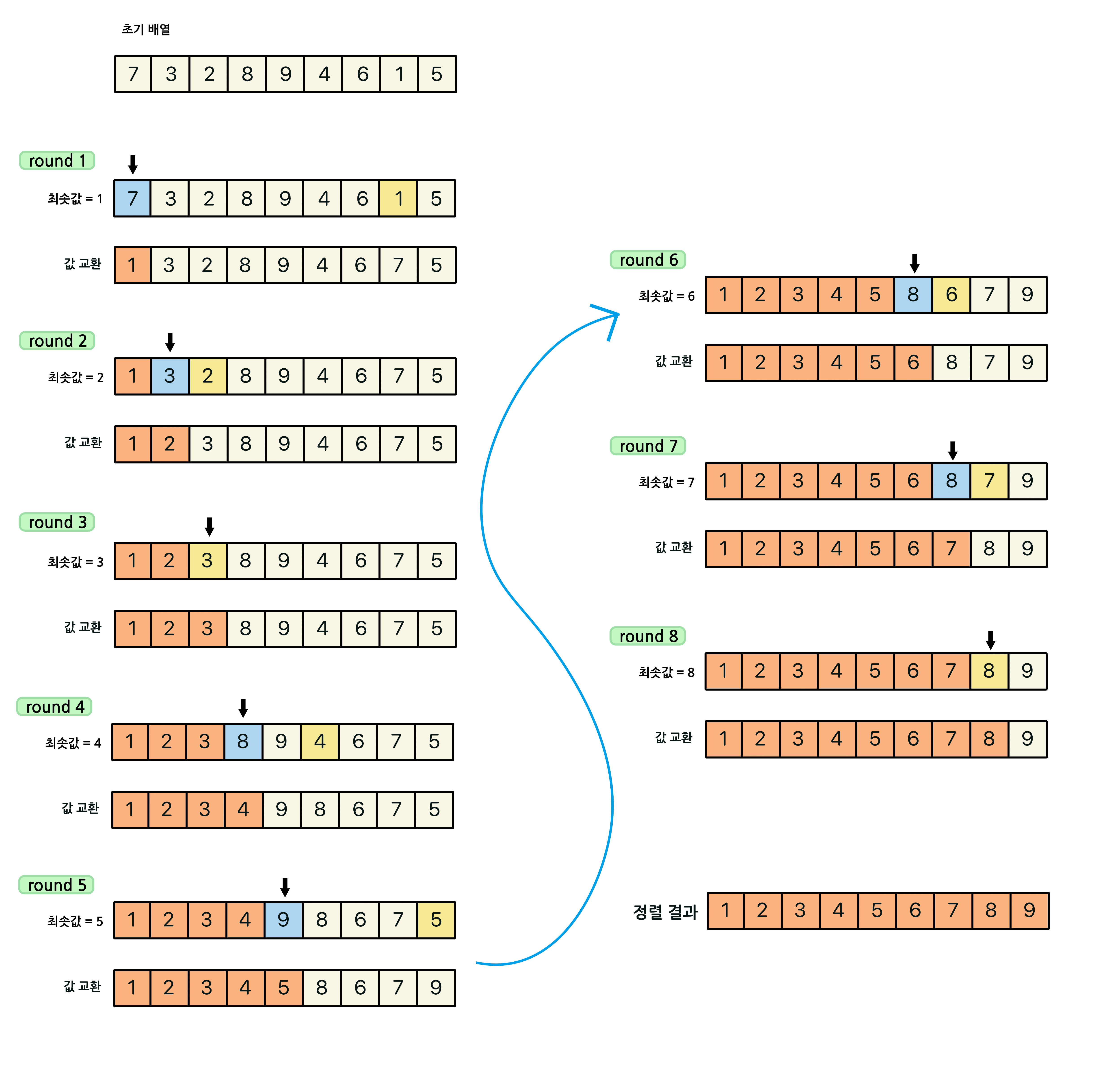 선택 정렬의 전체적인 과정은 이렇다.