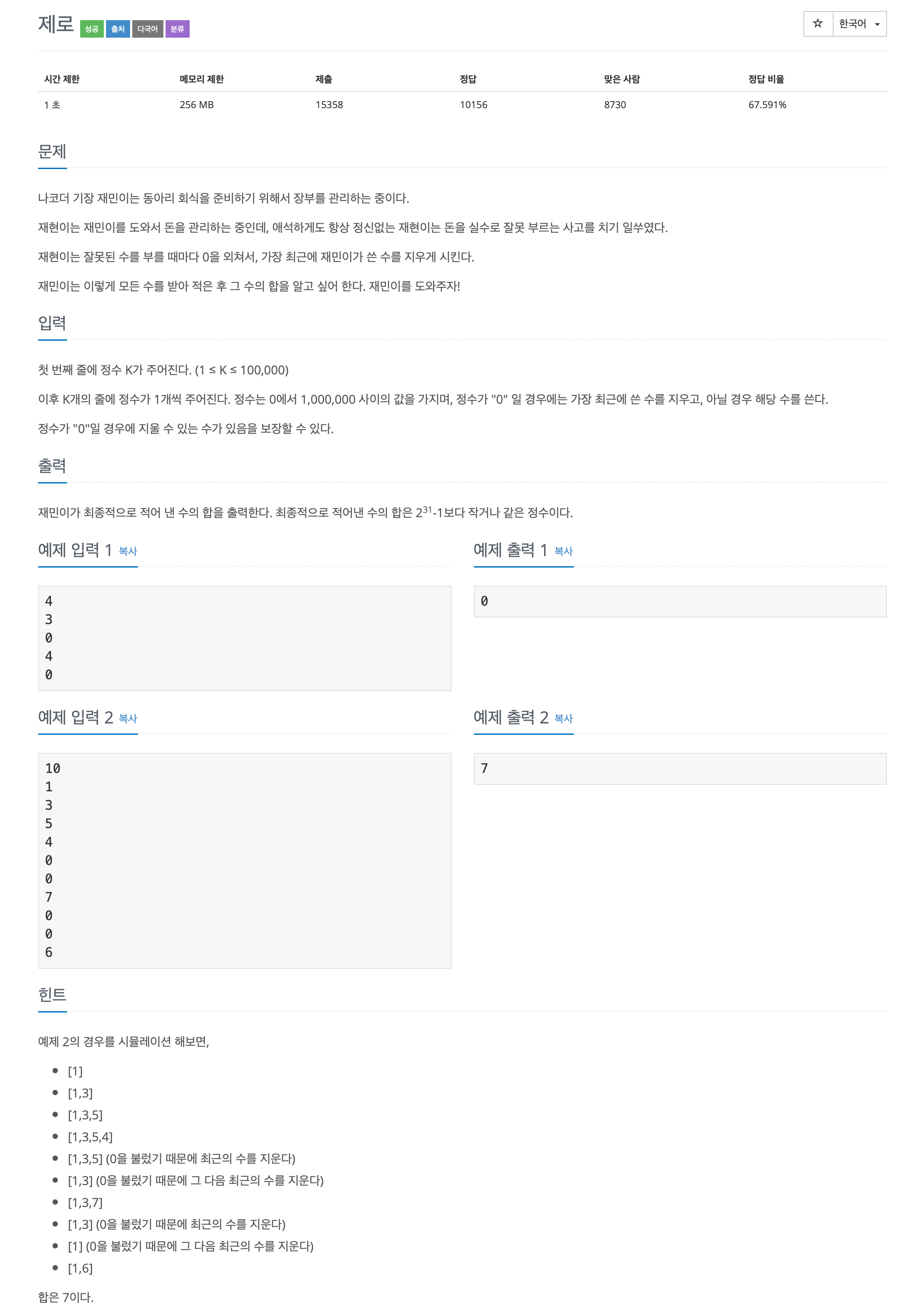 문제 지문이 길긴 하지만, 쉽게 이해하자면 0을 입력받으면 최근에 입력받았던 수를 지우면 된다. 또한 0을 입력받을 때 지울 수 있는 수가 보장된다고 했기때문에 예외 또한 고민 할 필요가 없다.