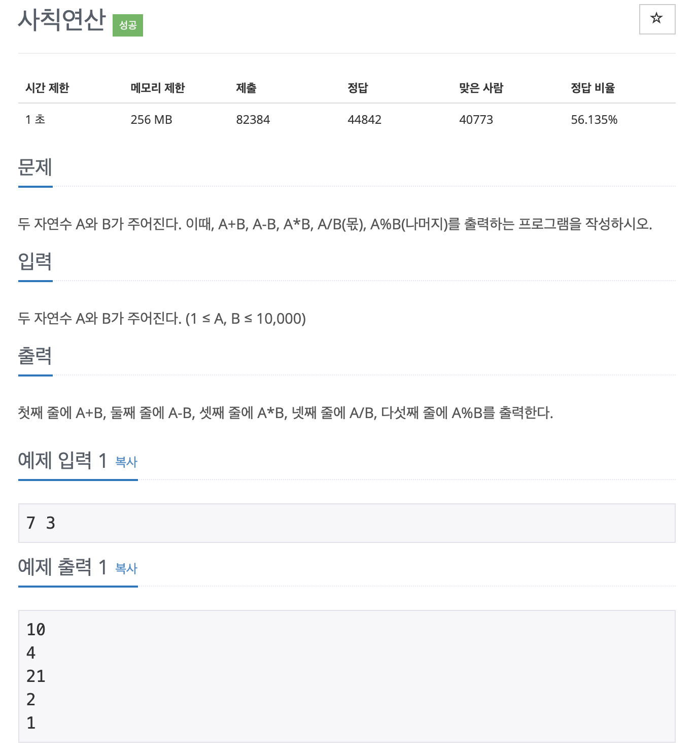 https://www.acmicpc.net/problem/1000 1000번: A+B 문제 두 정수 A와 B를 입력받은 다음, A+B를 출력하는 프로그램을 작성하시오. 입력 첫째 줄에 A와 B가 주어진다. (0 < A, B < 10) 출력 첫째 줄에 A+B를 출력..