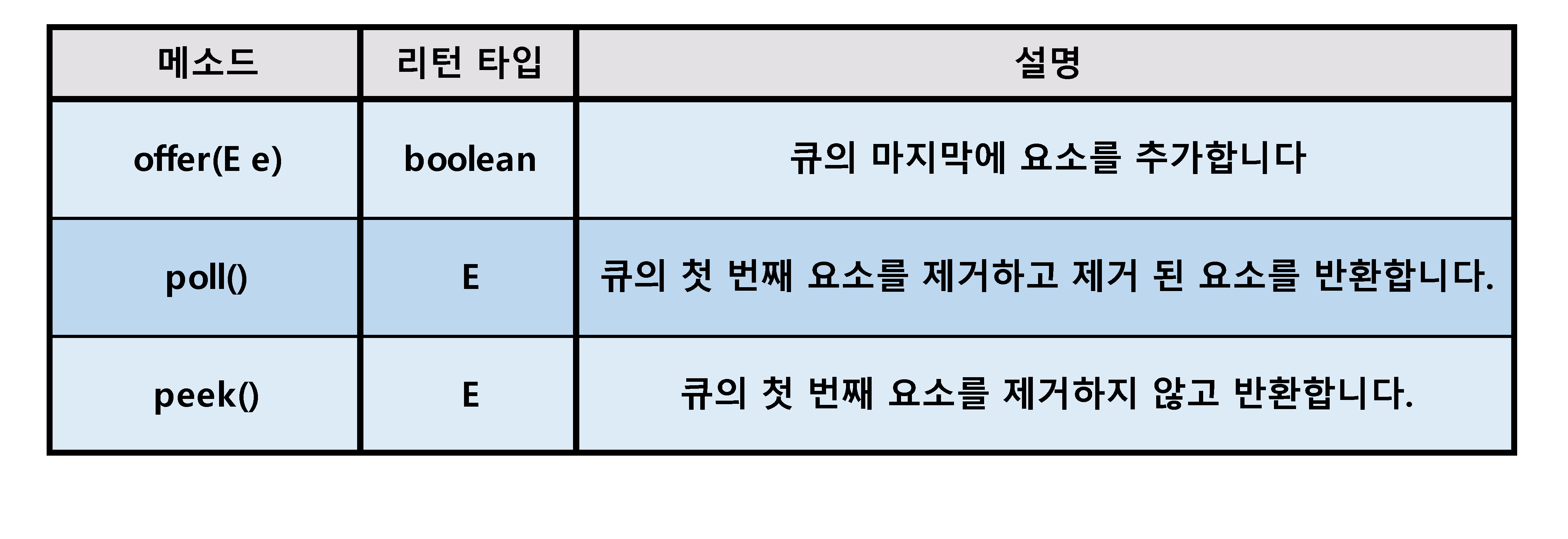 다만, Queue에서 기본적으로 offer, poll, peek을 많이 쓰기도 하고 원리도 비슷하니 이 셋만 쓸 것이다.