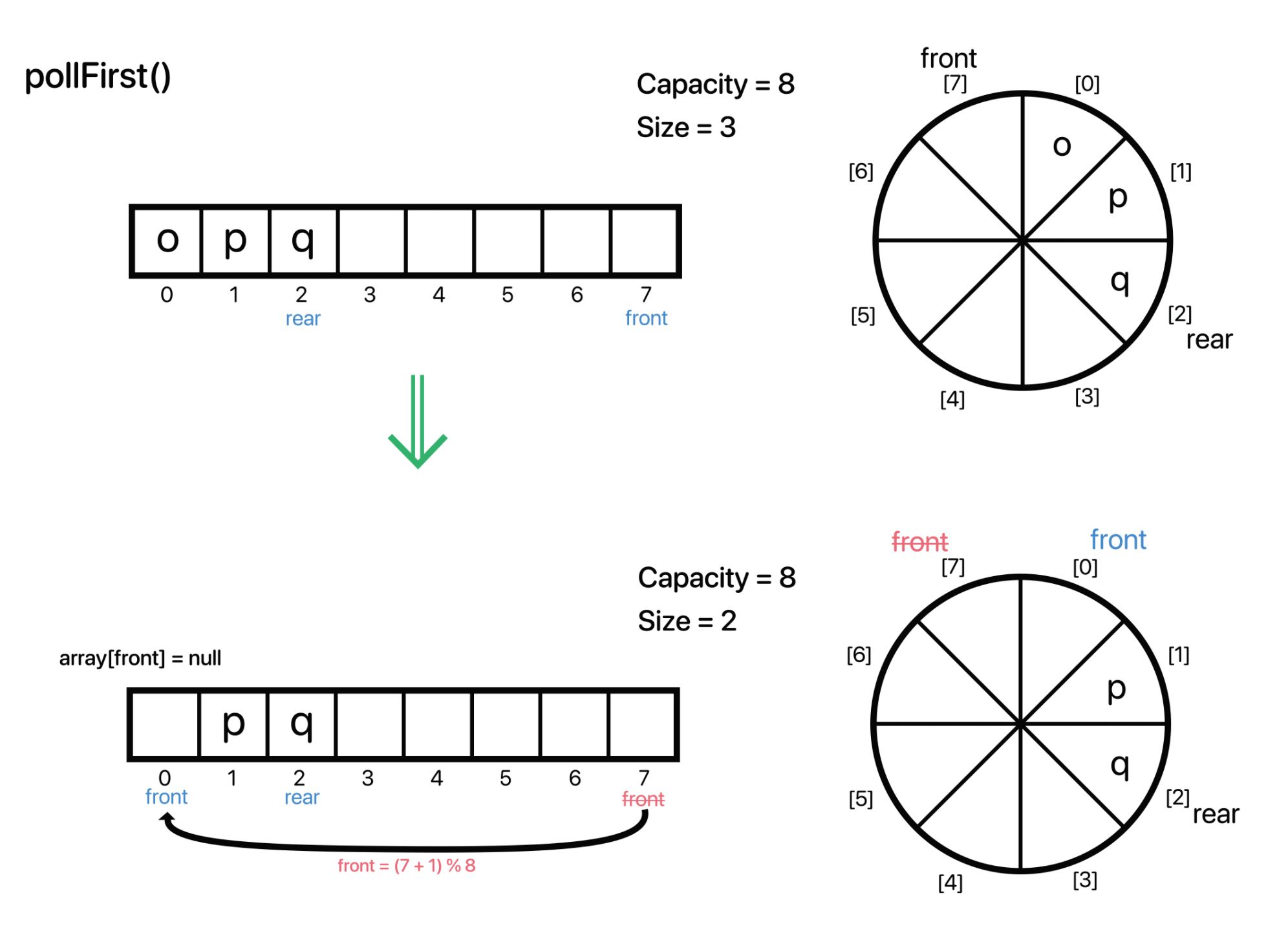 아무래도 Deque의 경우 양 방향이다보니 메소드들이 헷갈릴 수 있는데 다음 큐와 비교한 그림을 보면서 덱의 구조와 기본적인 메소드의 매칭을 잘 알아두도록 하자. 그리고 다시 한 번 말하지만 필자가 포스팅한 ArrayQueue(배열 큐) 글을 보고 오시길 바란다.