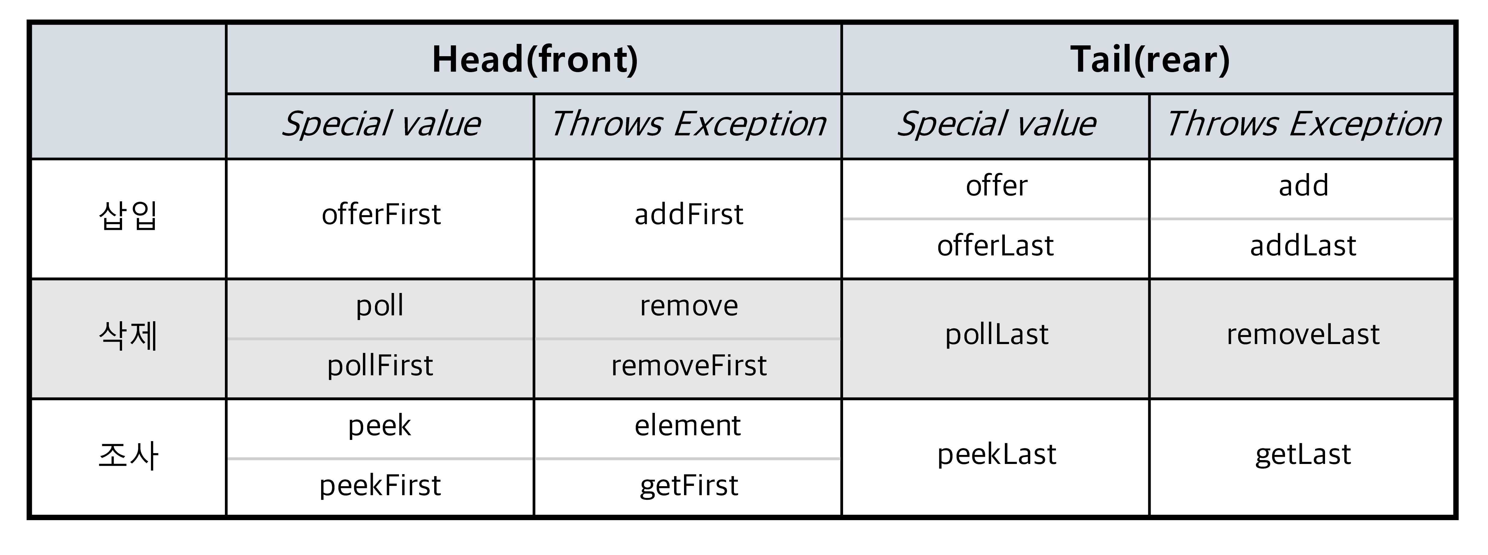 그 외에 peek(element) 의 경우도 peek(element)은 peekFirst와 같으며, peekLast은 따로 존재한다. 아래 표를 참고하시면 된다.