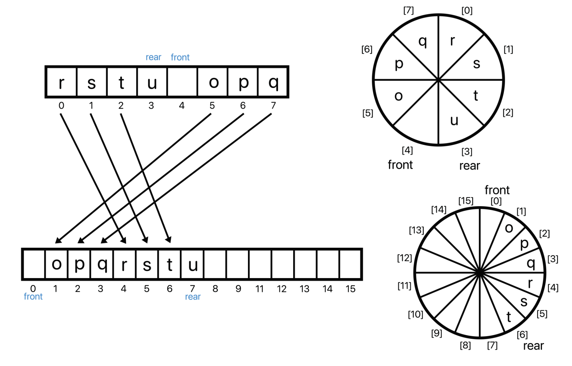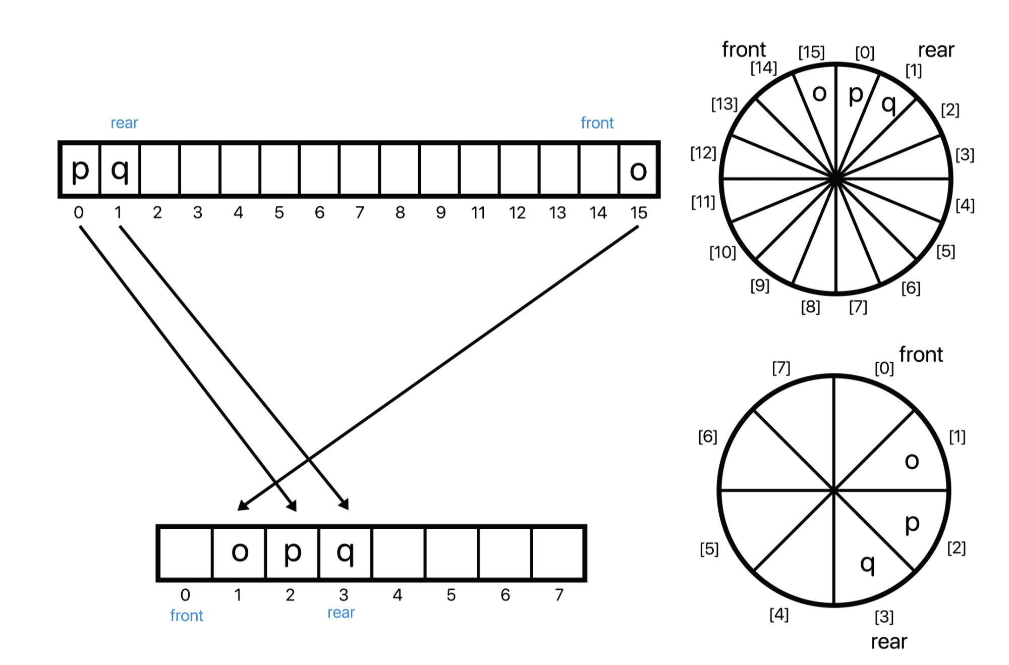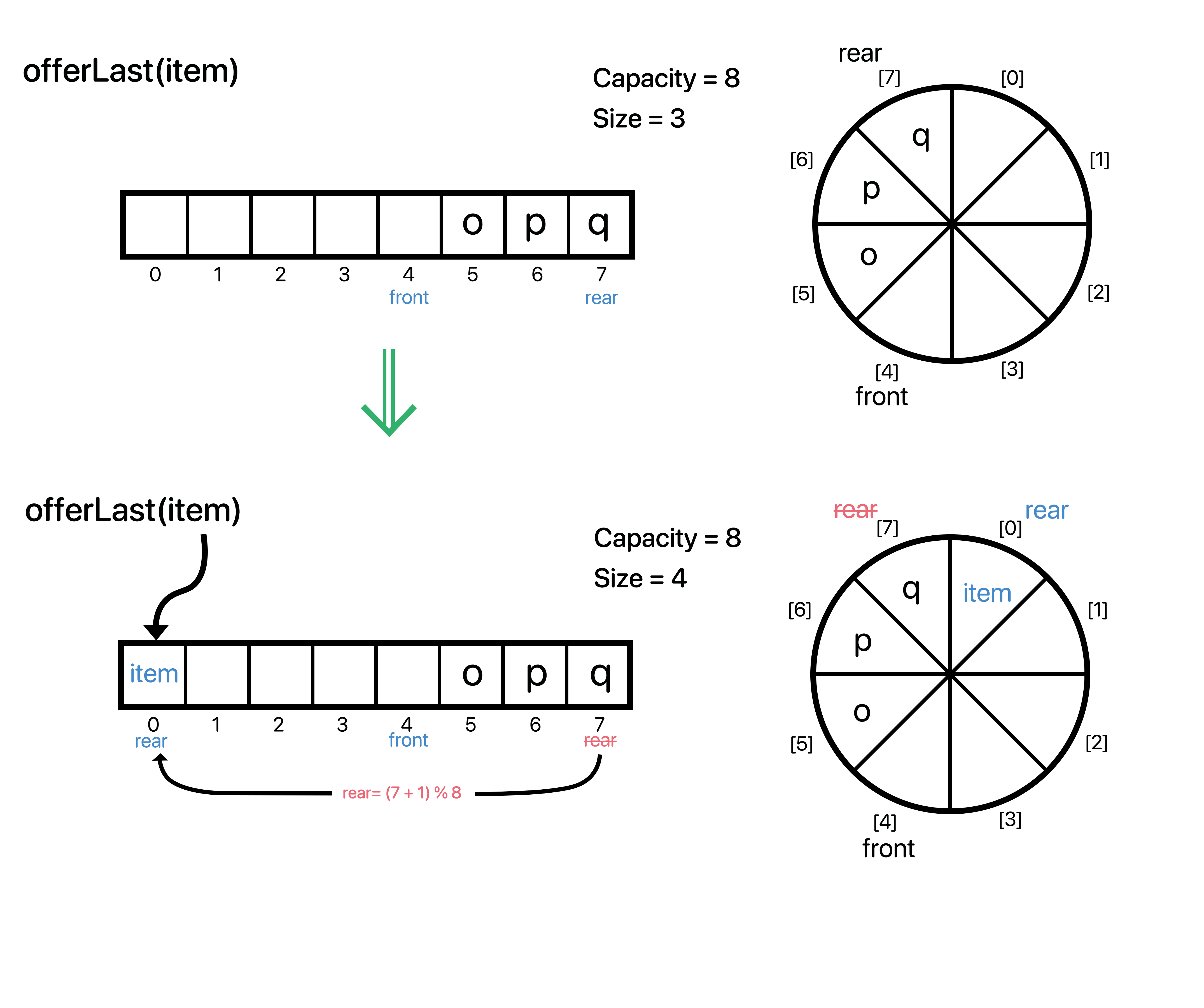 참고로 front와 rear은 '큐(Queue)' 관점을 기준으로 쓴다.