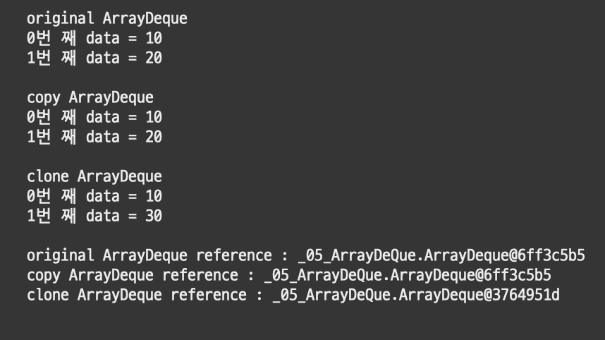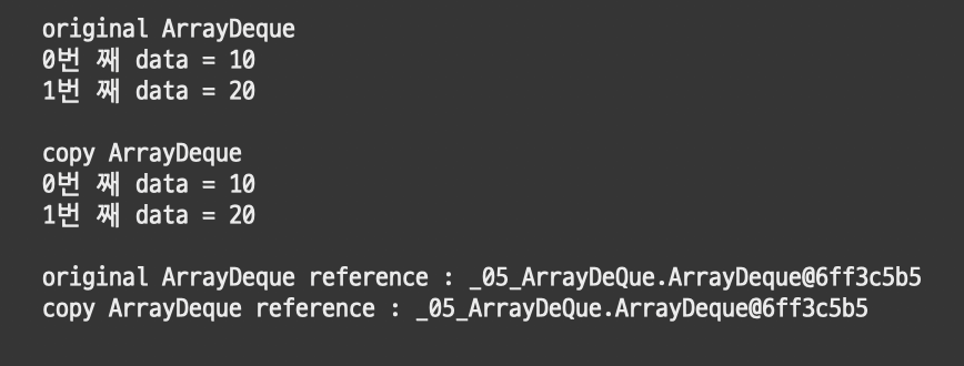 기본적으로 배열을 사용하여 구현되는 자료구조 클래스는 내부에서 최상위 타입 배열인 Object[] 배열을 사용하여 데이터들을 관리하고 있다. 그러면 덱 구조를 한 번 보도록하자.