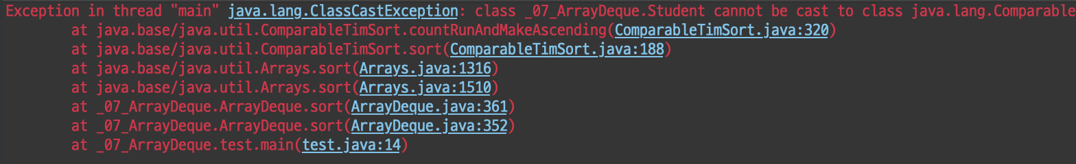 이렇게 Comparable을 구현하지 않아 해당 객체의 정렬 방법을 몰라 빨갛게 에러를 뱉어준다. 즉, 명시적으로 Arrays.sort()에 정렬 방법을 알려주던가, Student 클래스에 정렬 방법을 구현하던가 해야한다.