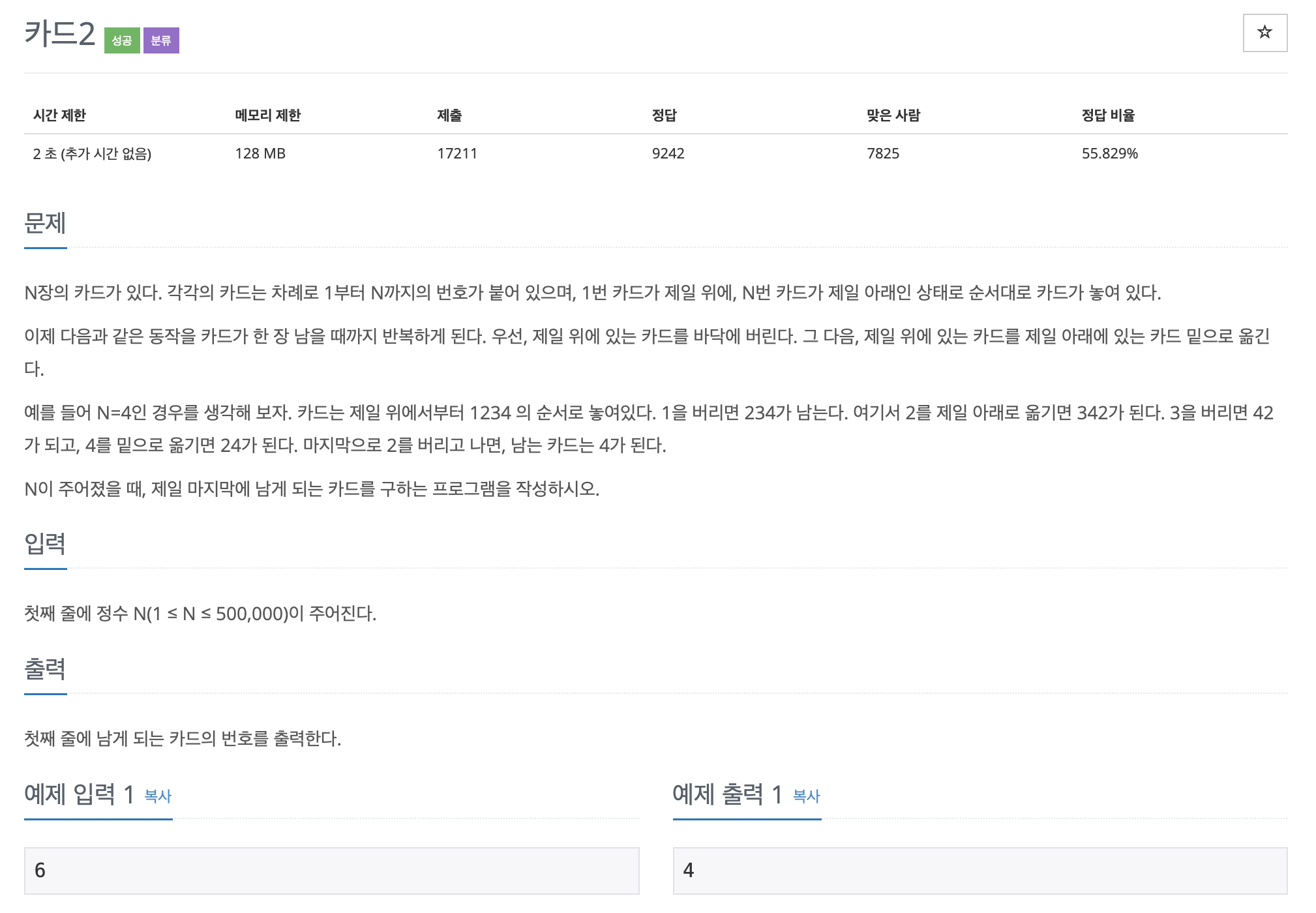 N장의 카드가 있다. 각각의 카드는 차례로 1부터 N까지의 번호가 붙어 있으며, 1번 카드가 제일 위에, N번 카드가 제일 아래인 상태로 순서대로 카드가 놓여 있다. 이제 다음과 같은 동작을 카드가