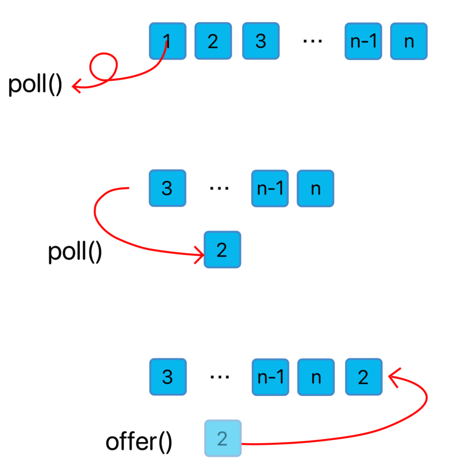 즉, 두 가지 메소드 poll, offer만 이해하면 쉽게 풀이할 수 있다. 좀 더 그림으로 쉽게 보자면 이렇다.
