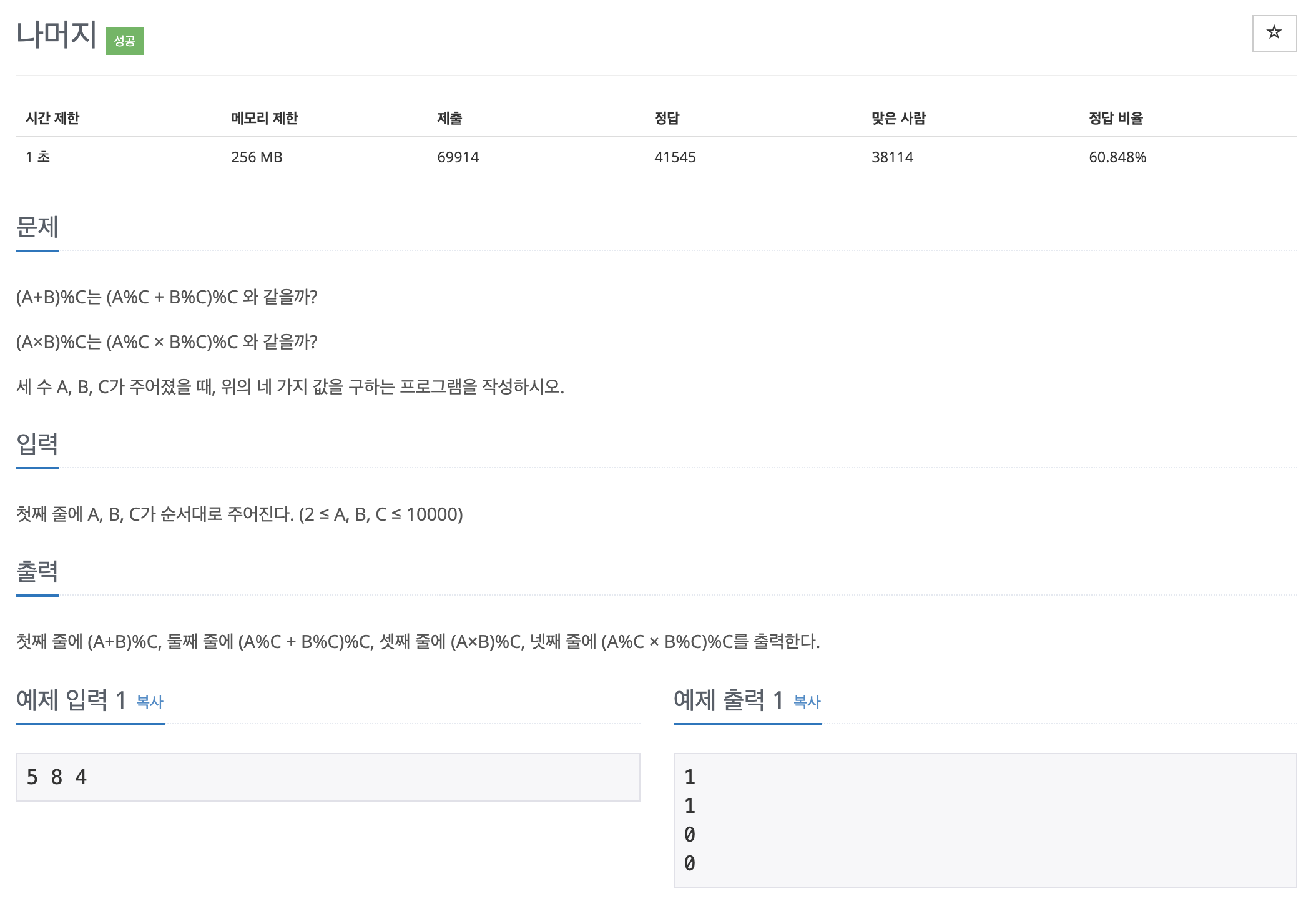 문제는 간단했지만 모듈러 연산의 두가지 속성에 대해 알아두었으면 좋겠다 싶어 글이 길어졌다.