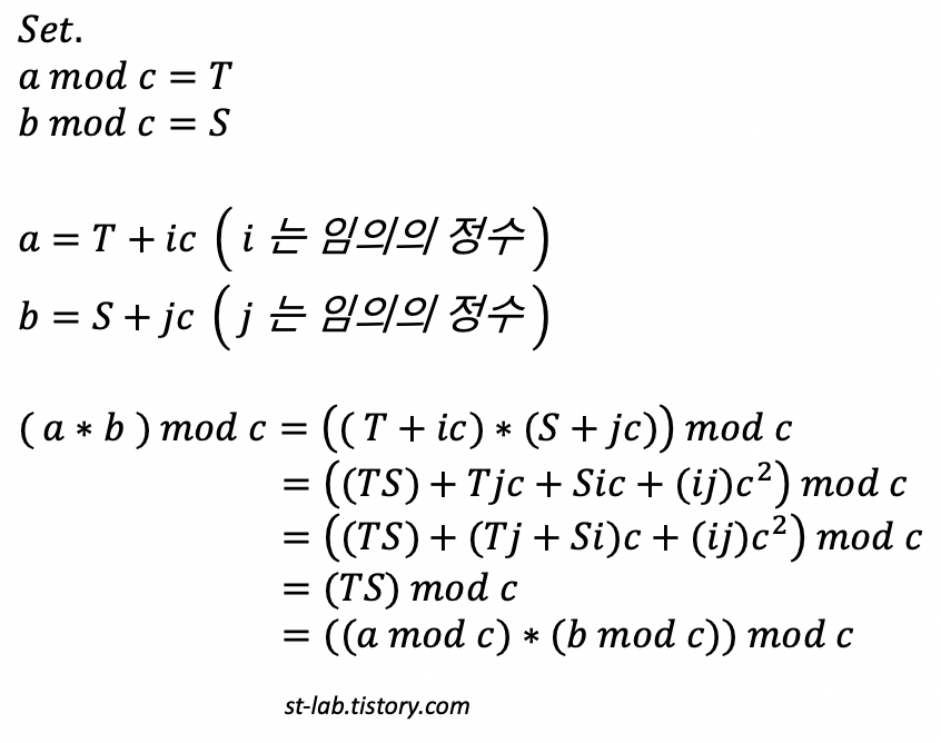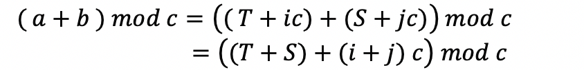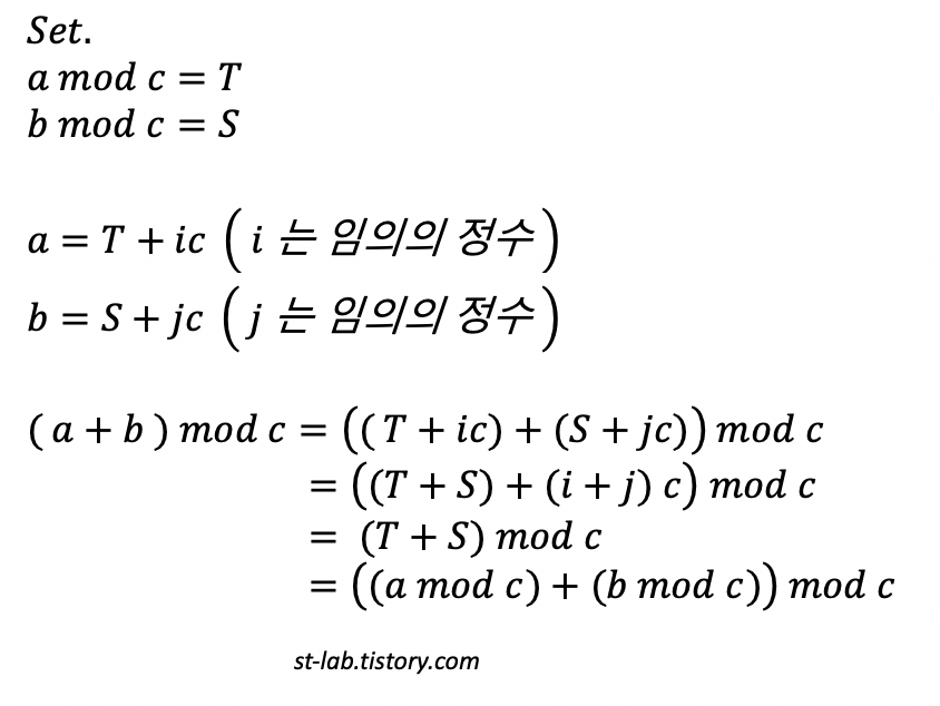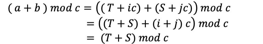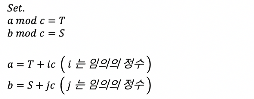 먼저 a 와 b에 대해 c로 나눈 나머지 값을 mod 로 표현하여 정의한다. (이때 T 와 S 는 a 와 b 의 나머지다)