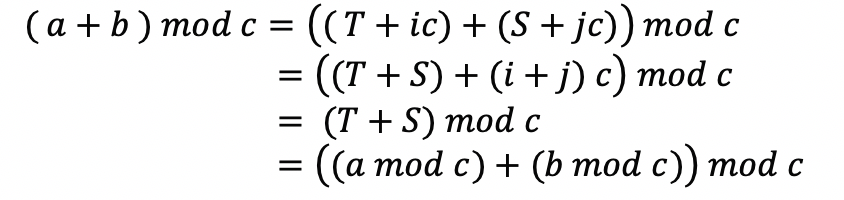그리고 T 와 S 는 처음 정의했듯이 각 각 a mod c 와 b mod c 이므로 이들로 교체해주면 우리가 증명하고자 한 공식이 완성된다.