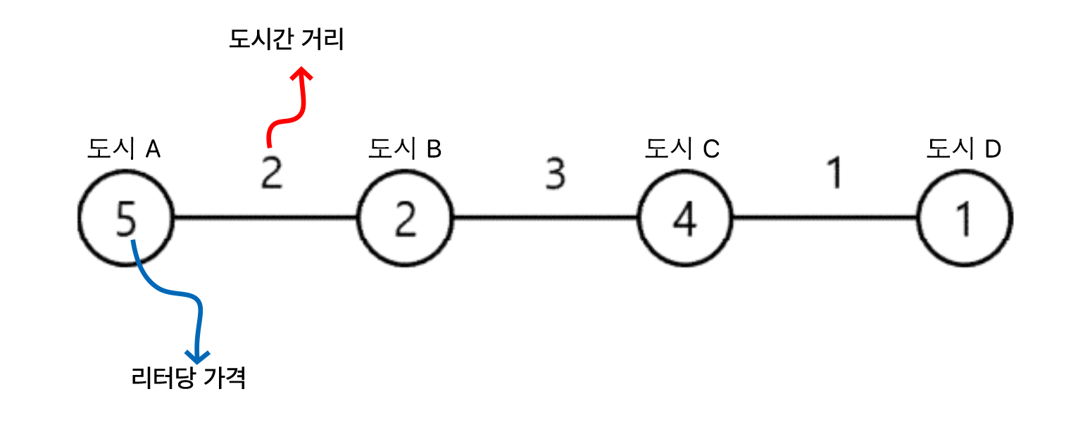 정리하자면 A도시 주유소에서 2km를 가기 위해 2L를 채워 2 * 5 = 10원의 비용이 들고, B도시의 주유소에서 D까지 4km를 가기위해 4L를 채워 4L * 2 = 8원의 비용이 든다.
