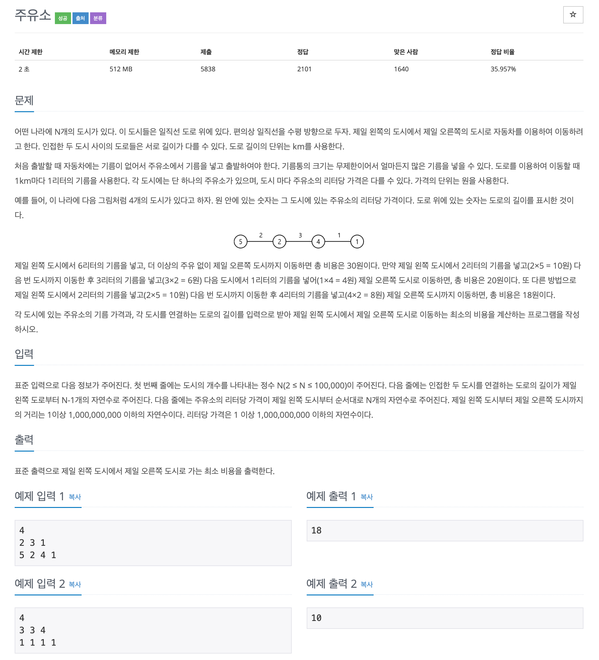 먼저 N개의 도시가 있고, 각 도시를 잇는 N-1개의 도로가 있다. 그리고 각 도시에는 주유소의 리터당 가격이 써져 있고, 각 도로에는 거리가 적혀져 있다. (1km당 1L 기름을 사용함)