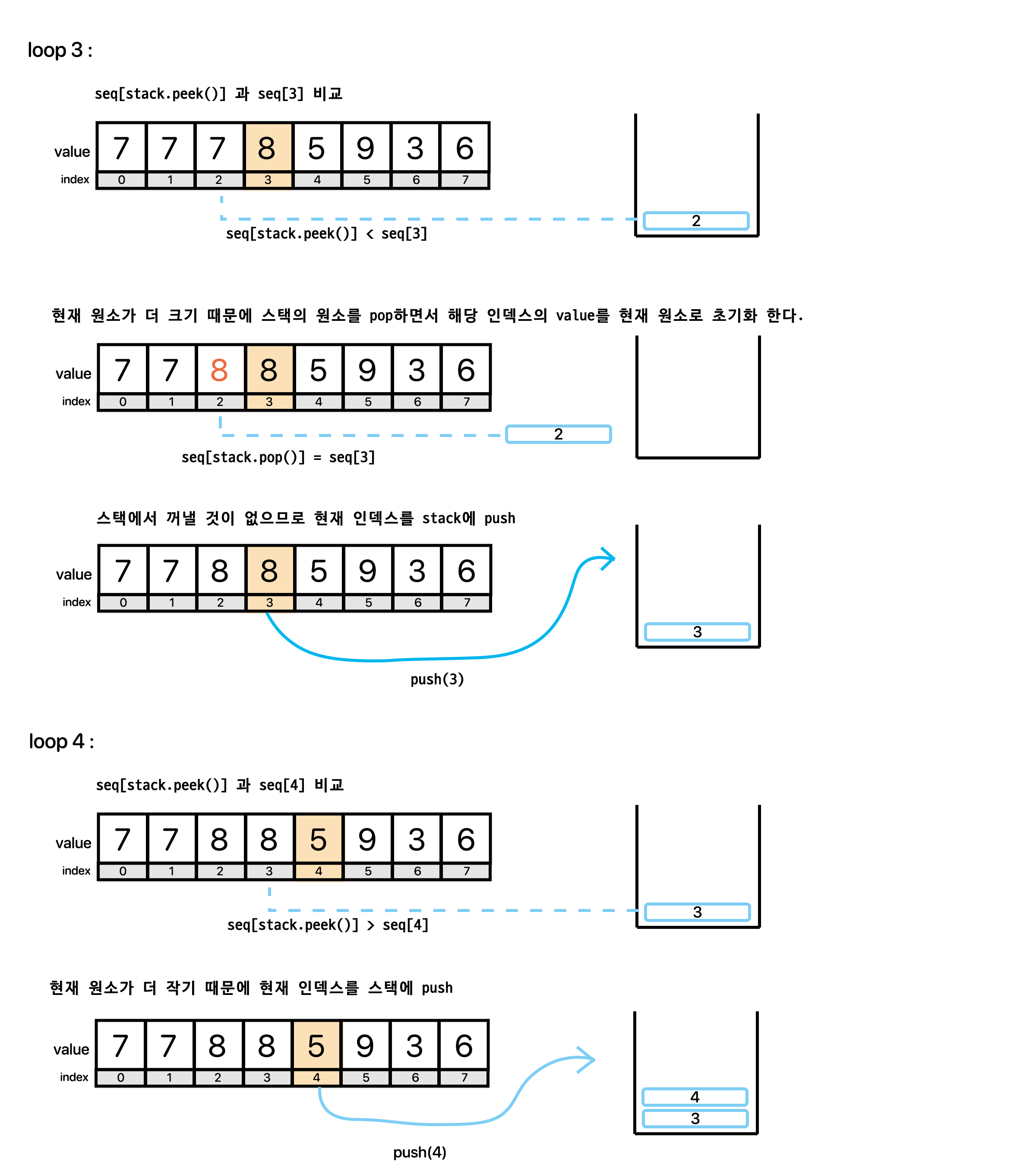 → 8 (seq[3]) > 4 (seq[stack.peek() = 2]) 이므로 seq[stack.pop() = 2] = 8 (seq[3])