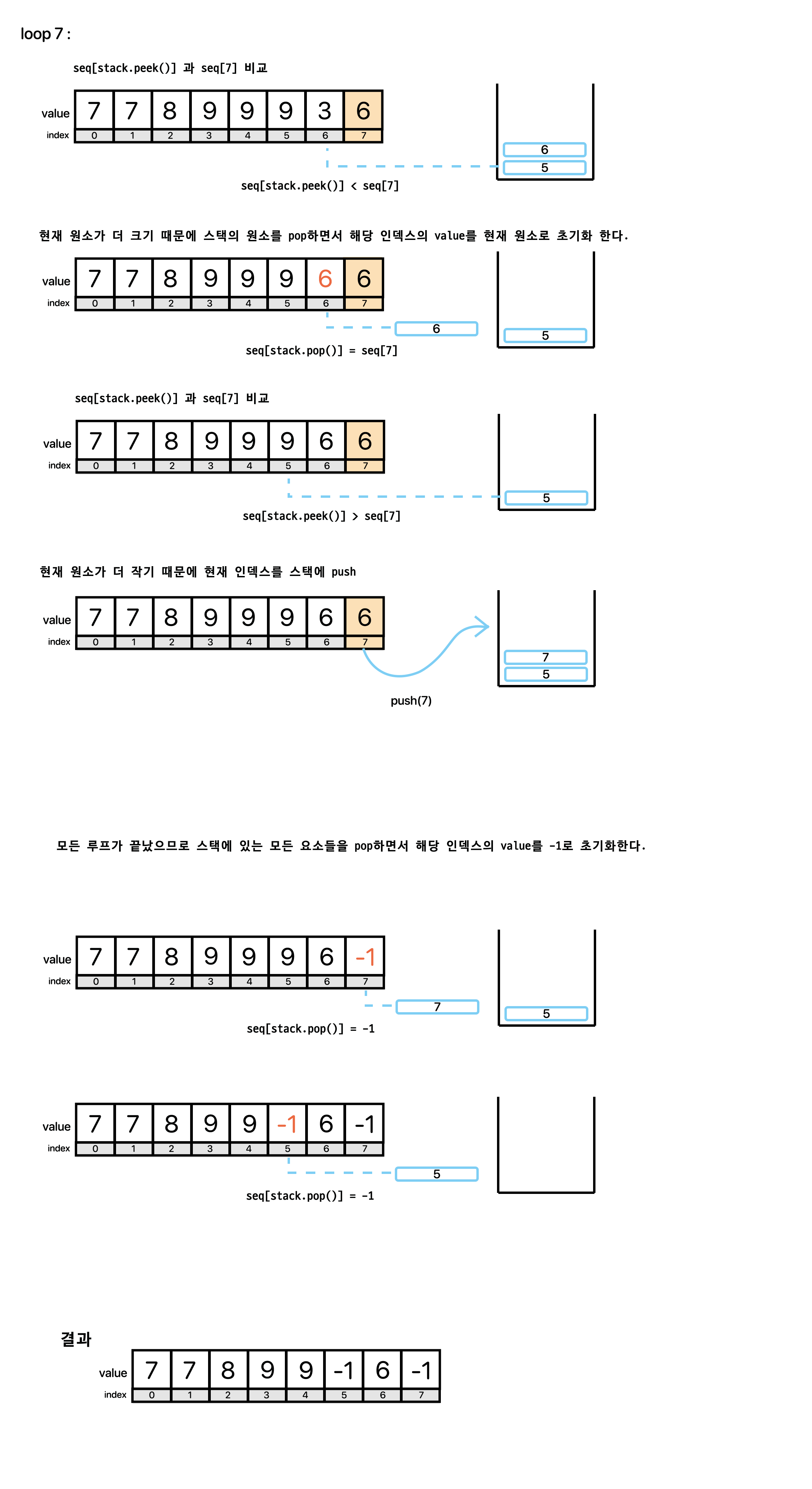 이는 즉, stack에 저장된 seq의 인덱스 값들은 자연스레 해당 인덱스의 값보다 뒤에서 큰 수가 없다는 의미이므로 모두 -1이 된다.