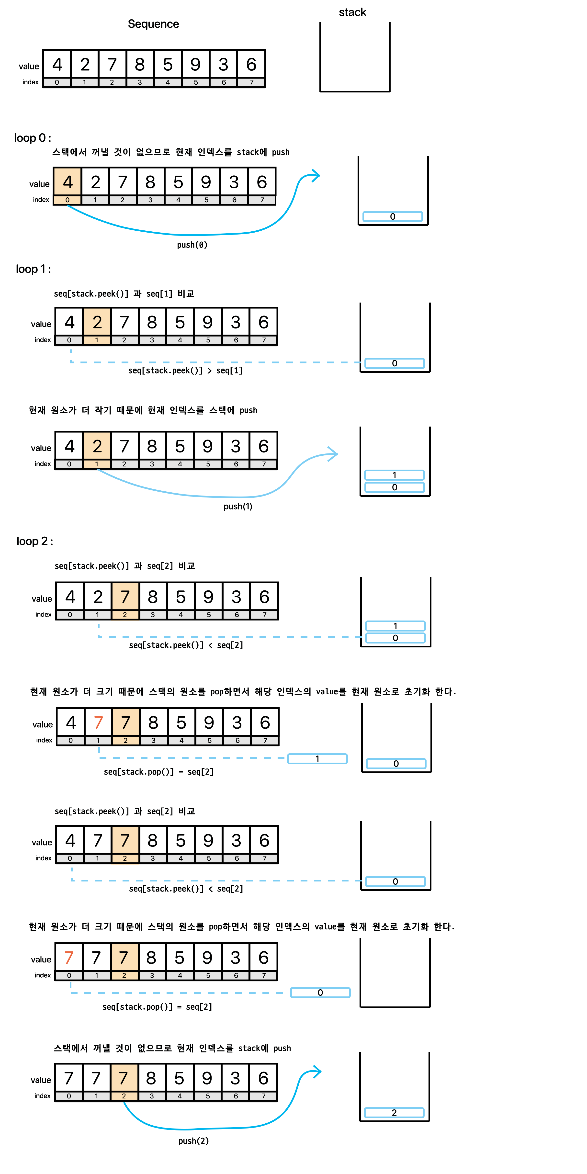 바로 수열을 탐색하면서 현재 원소가 이전의 원소보다 작을 때 까지 stack에 수열의 index를 stack에 추가(push) 하는 것이다. 그리고 만약 현재 원소가 스택의 top 원소를 인덱스로 하는 수열의 원소보다 크게 될 경우 stack의 원소를 pop하면서 해당 인덱스에 해당하는 원소들을 현재 원소로 바꿔주는 것이다.