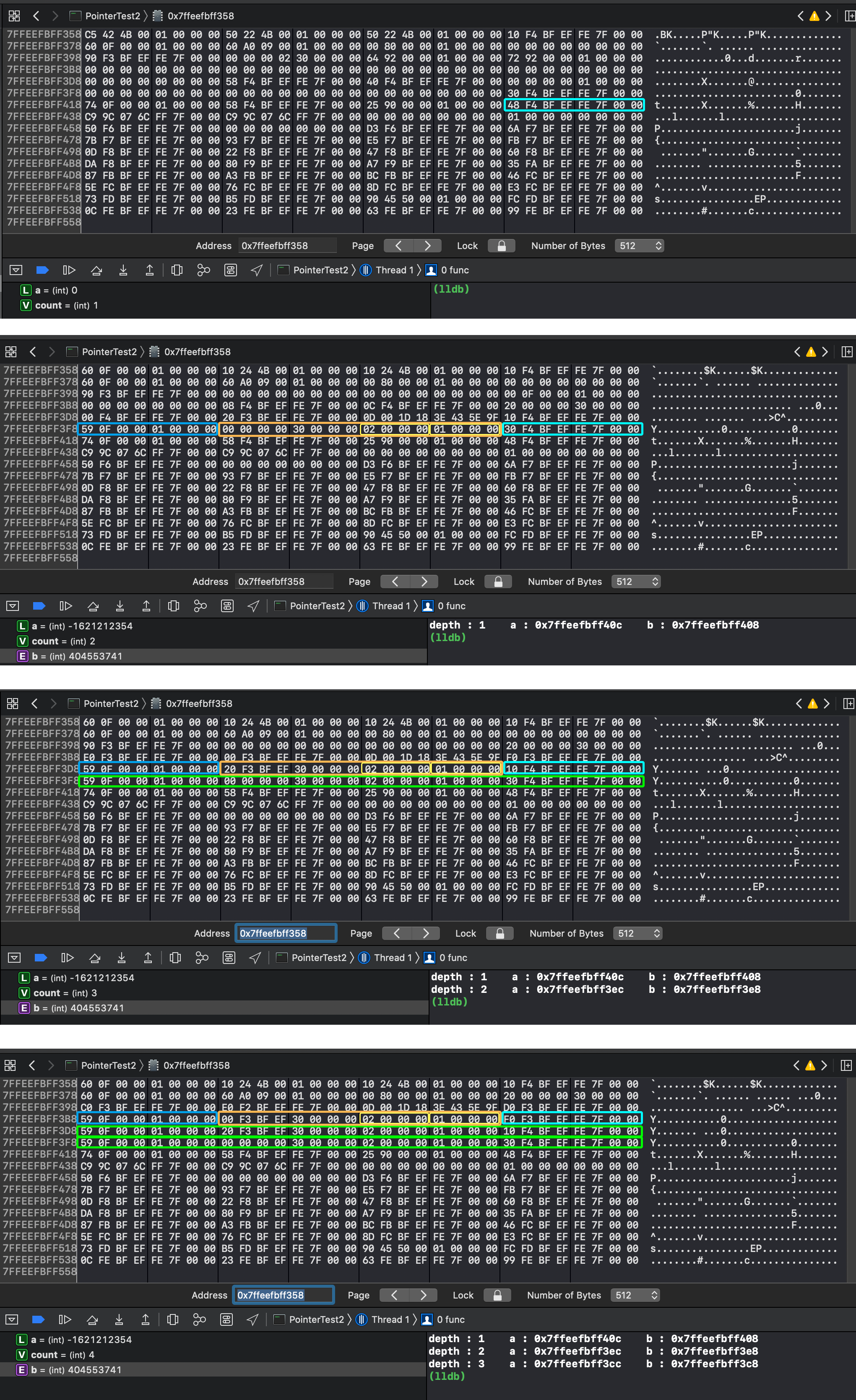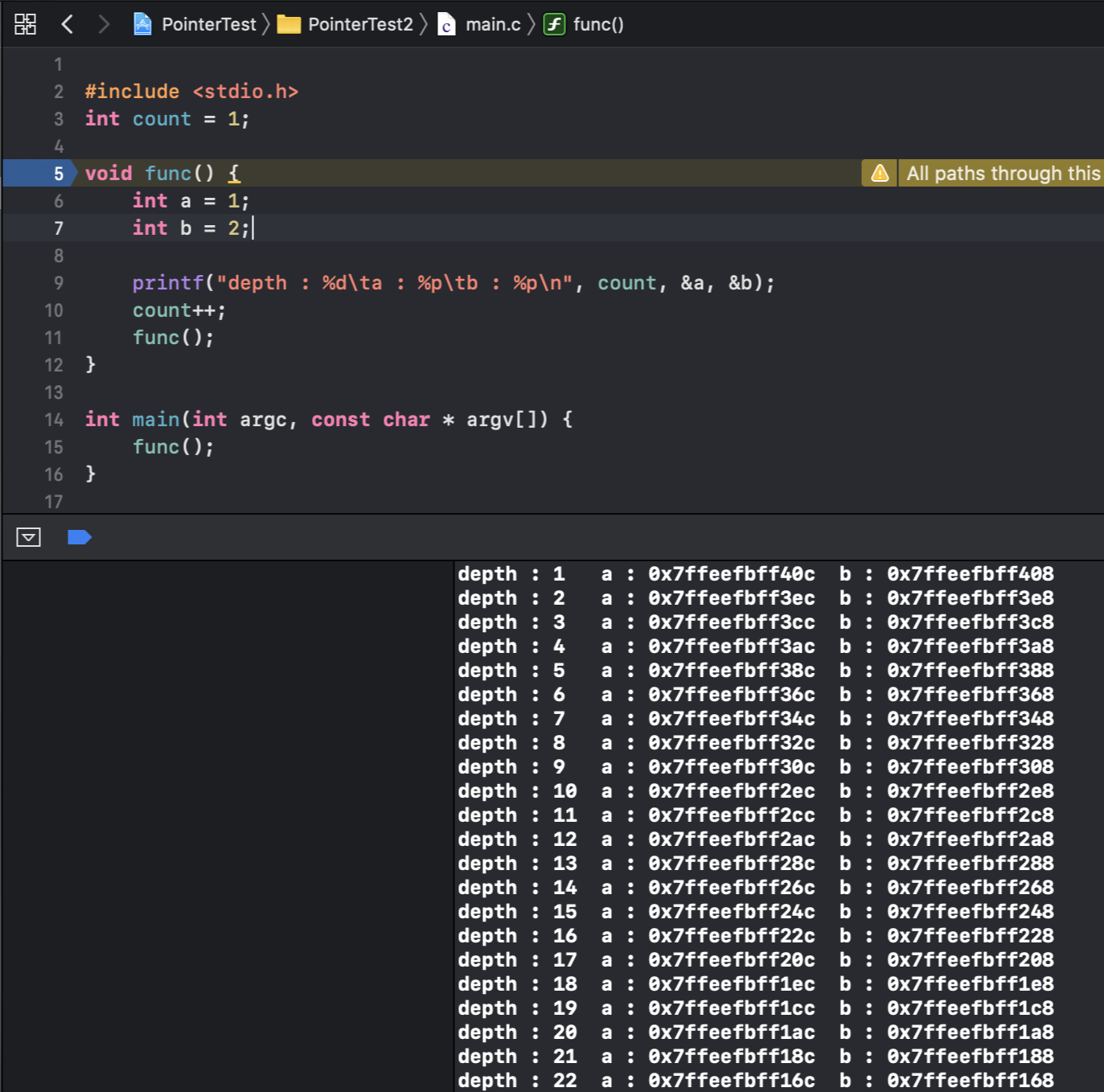 printf("depth : %d\ta : %p\tb : %p\n", count, &a, &b);