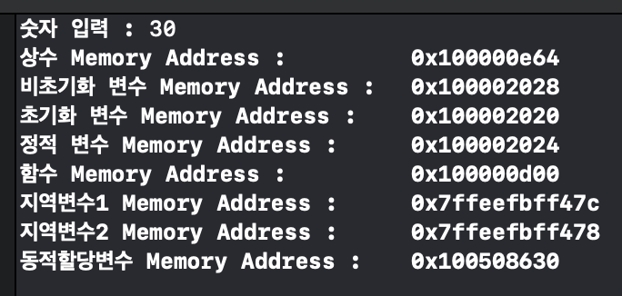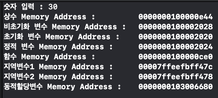 이 것 또한 4가지 영역과 관련이 있습니다. 실제로 Data영역들은 낮은 주소에 할당되고, Heap, Stack의 경우는 비교적 높은 주소에 할당되거든요.